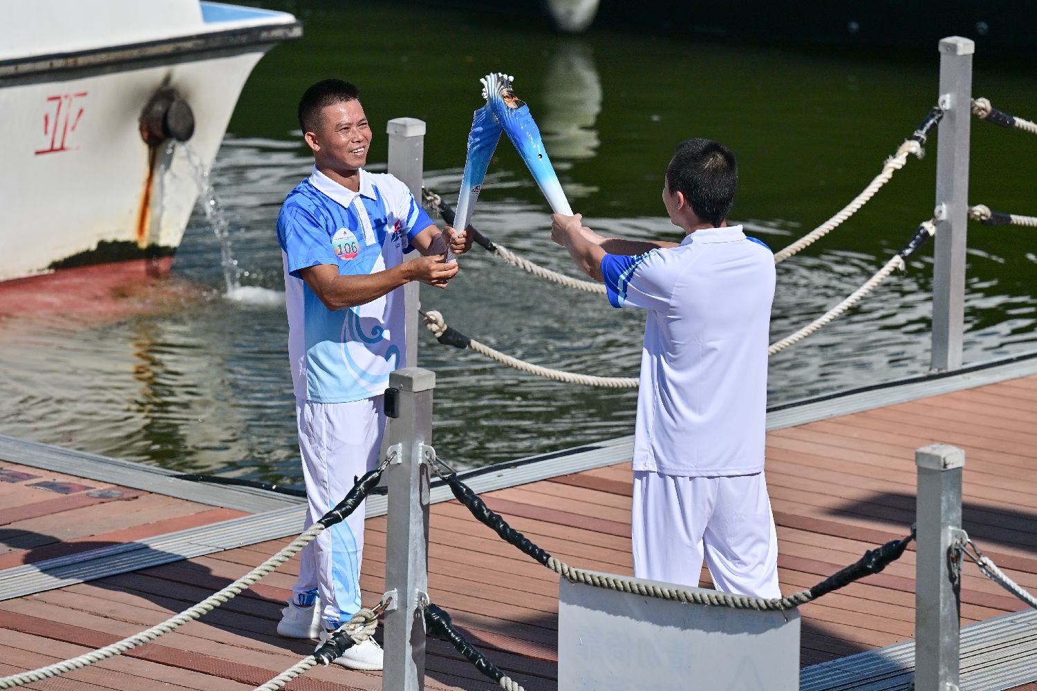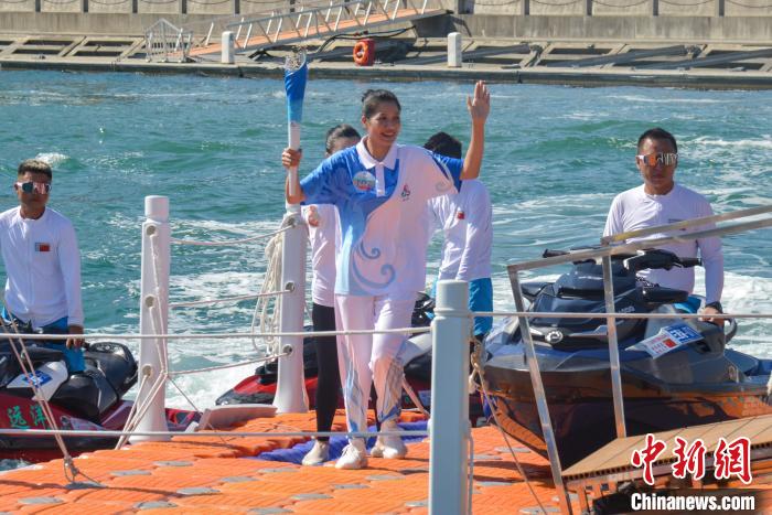 第107棒火炬手黄丽珠乘坐摩托艇抵达收火仪式现场。中新网