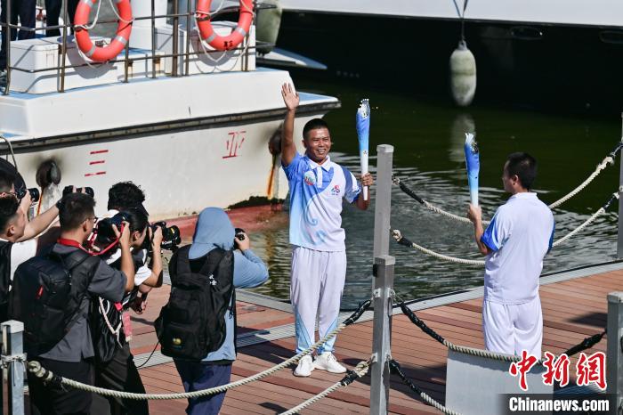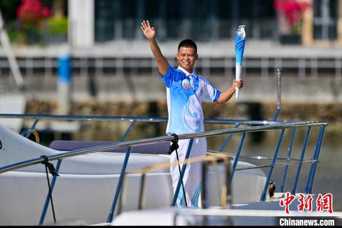 第106棒火炬手、三沙市七连屿赵述岛社区居委会主任梁锋乘船传递火炬。中新网