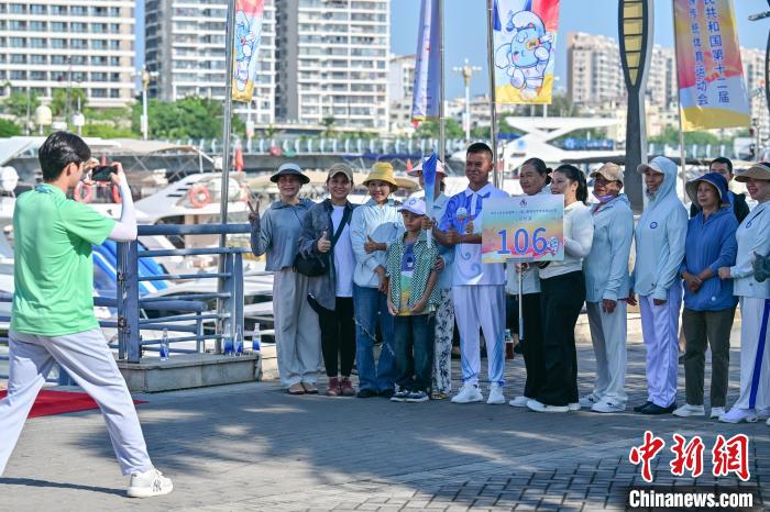 11月17日,第十二届全国少数民族传统体育运动会火炬实地传递活动在海南三亚举行,107棒来自各行各业的火炬手通过“海陆空”接力方式完成火炬传递。图为第106棒火炬手、三沙市七连屿赵述岛社区居委会主任梁锋乘船在海上传递火炬。中新社