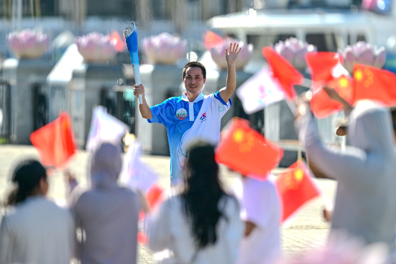 第105棒火炬手张保会向现场民众挥手。中新社