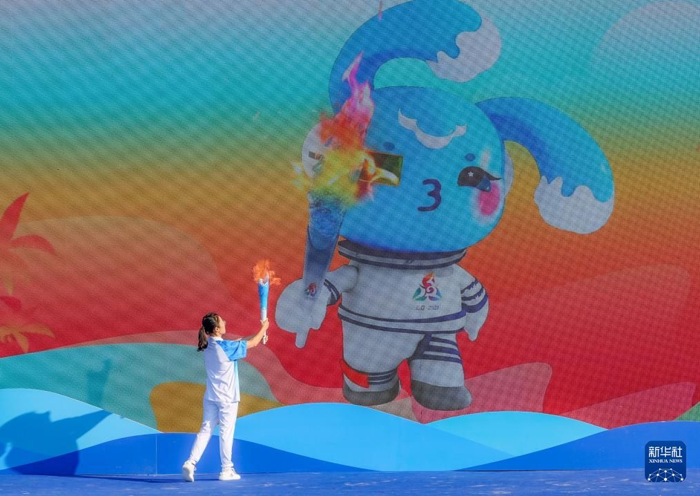 火炬手韩晓燕在起跑仪式上与本届运动会吉祥物“吉贝”对接,点燃火炬。新华社