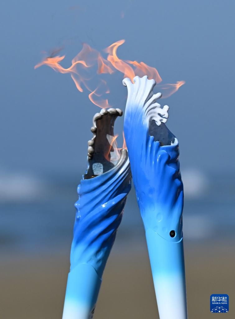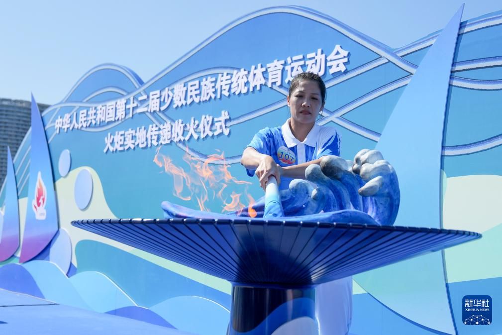 火炬手黄丽珠在收火仪式上点燃火种盆。新华社