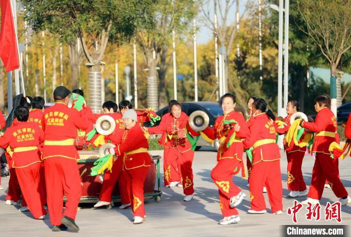 乡村运动会现场,锣鼓队表演。