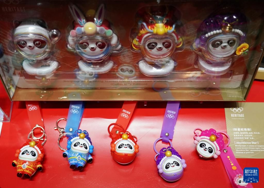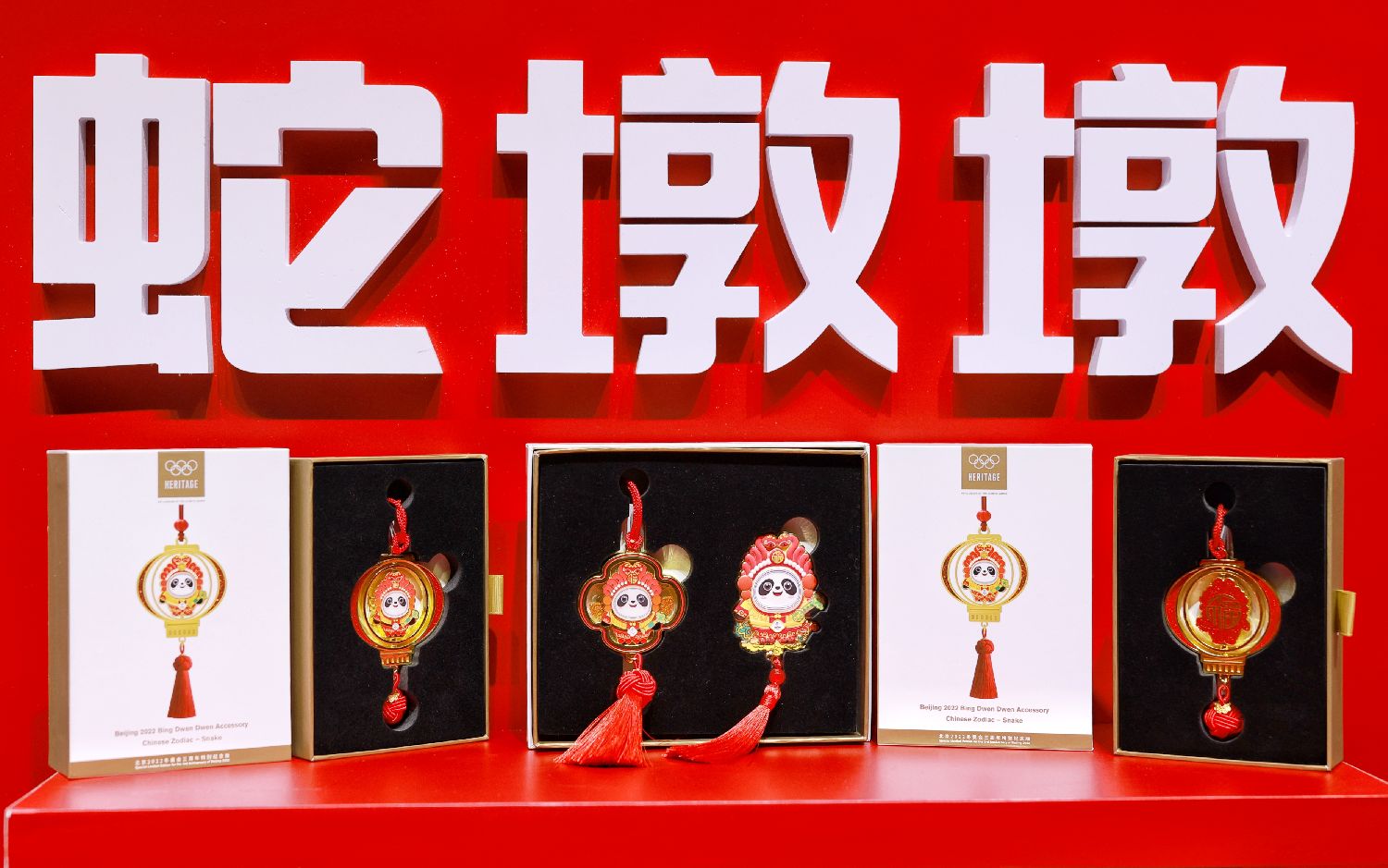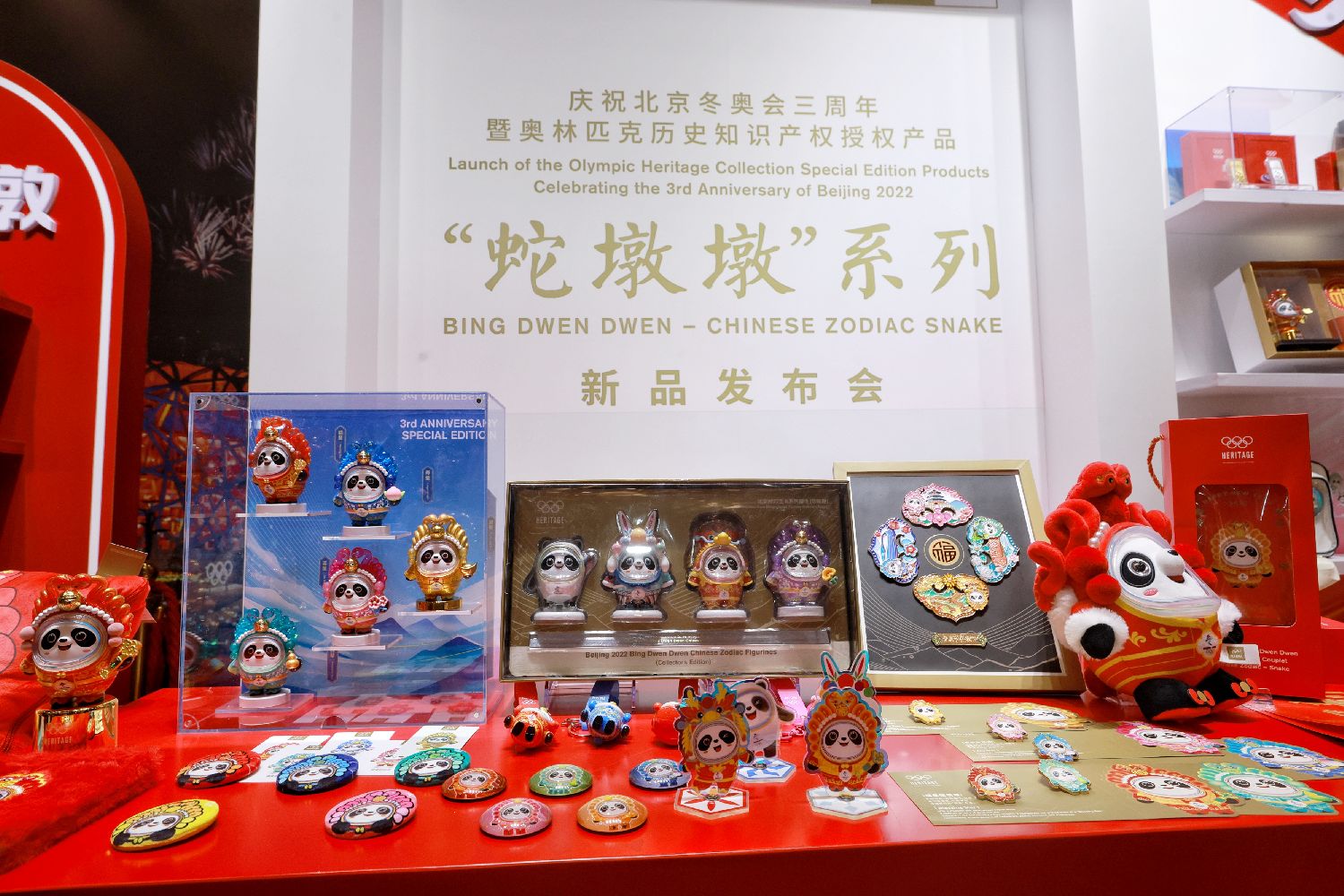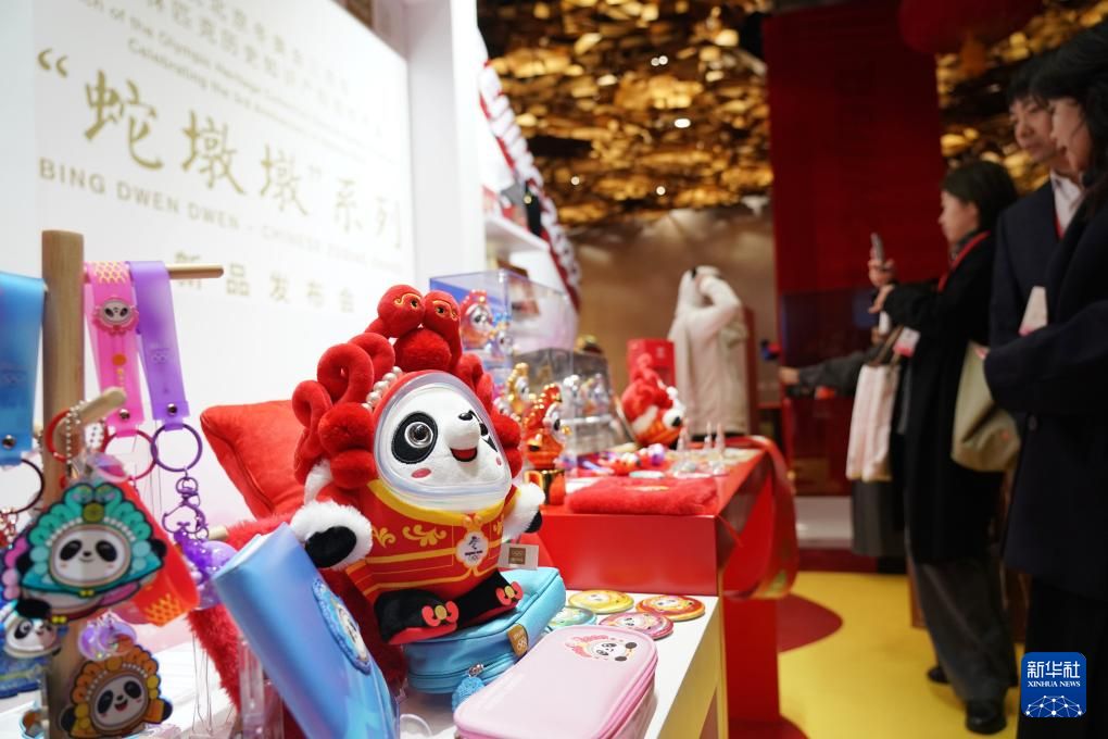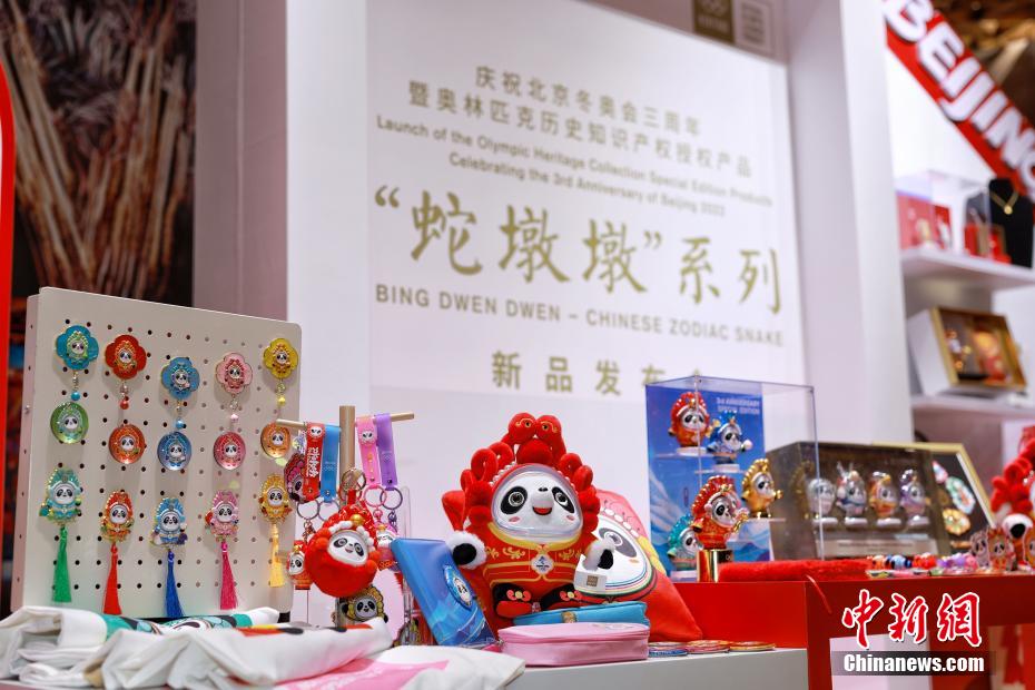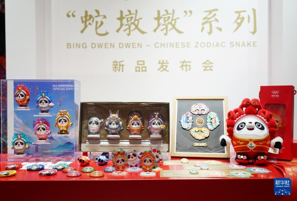11月19日,庆祝北京冬奥会三周年暨奥林匹克历史知识产权授权产品——“冰墩墩”蛇年新春特别版“蛇墩墩”系列新品在北京发布。“蛇墩墩”以中国传统民间传说《白蛇传》为灵感来源,头部装饰以传统京剧中的“白娘子”和“小青”造型为蓝本,塑造了两条“蛇仙”,形态蜿蜒前进,在中心汇合,共同吐出“福禄寿喜财”金珠,表达“灵蛇献瑞”的吉祥喜庆氛围。两条灵蛇相互扶持与合作的形象,传递出团结与奋进的奥运精神。图为发布会现场展出的“蛇墩墩”系列新品。中新社