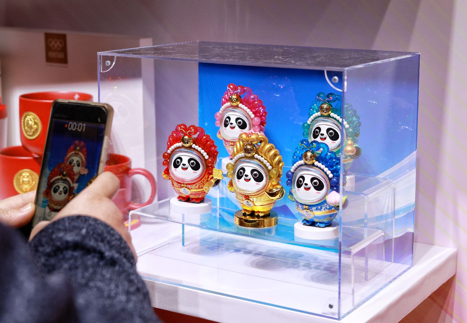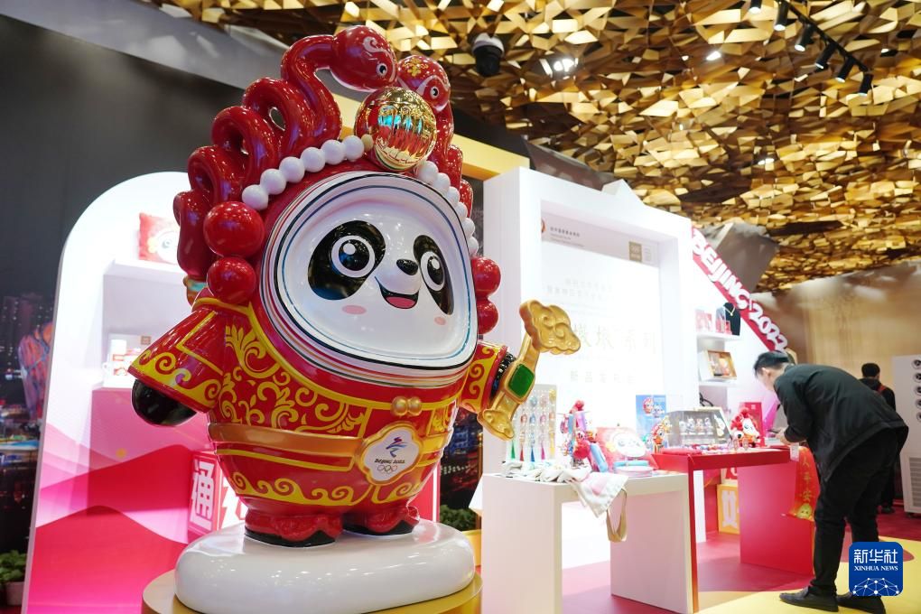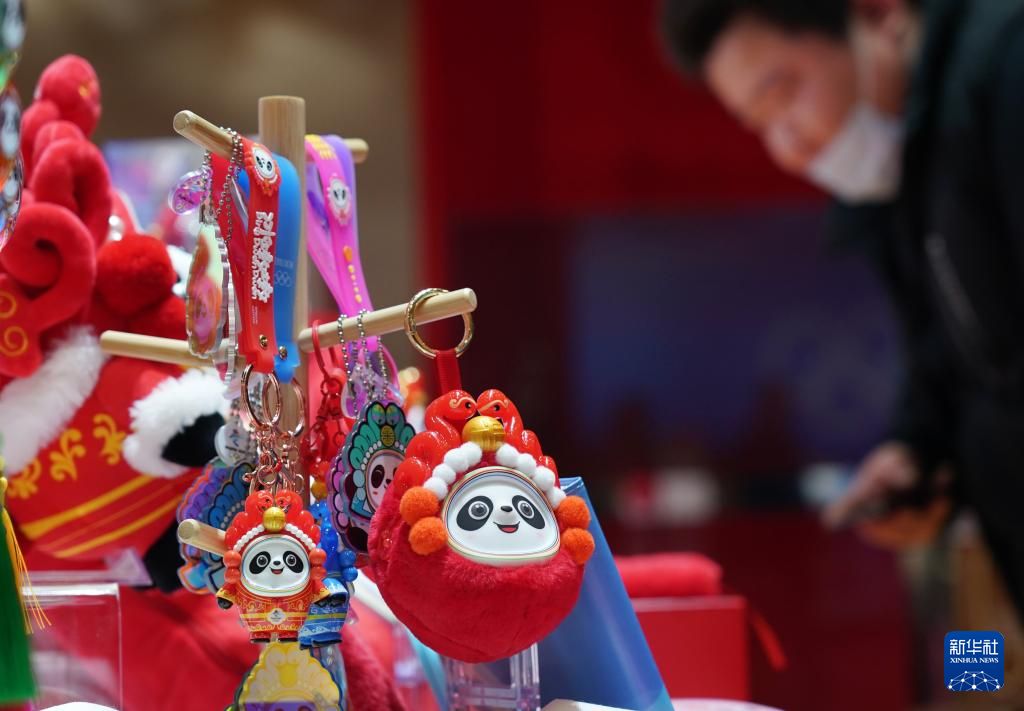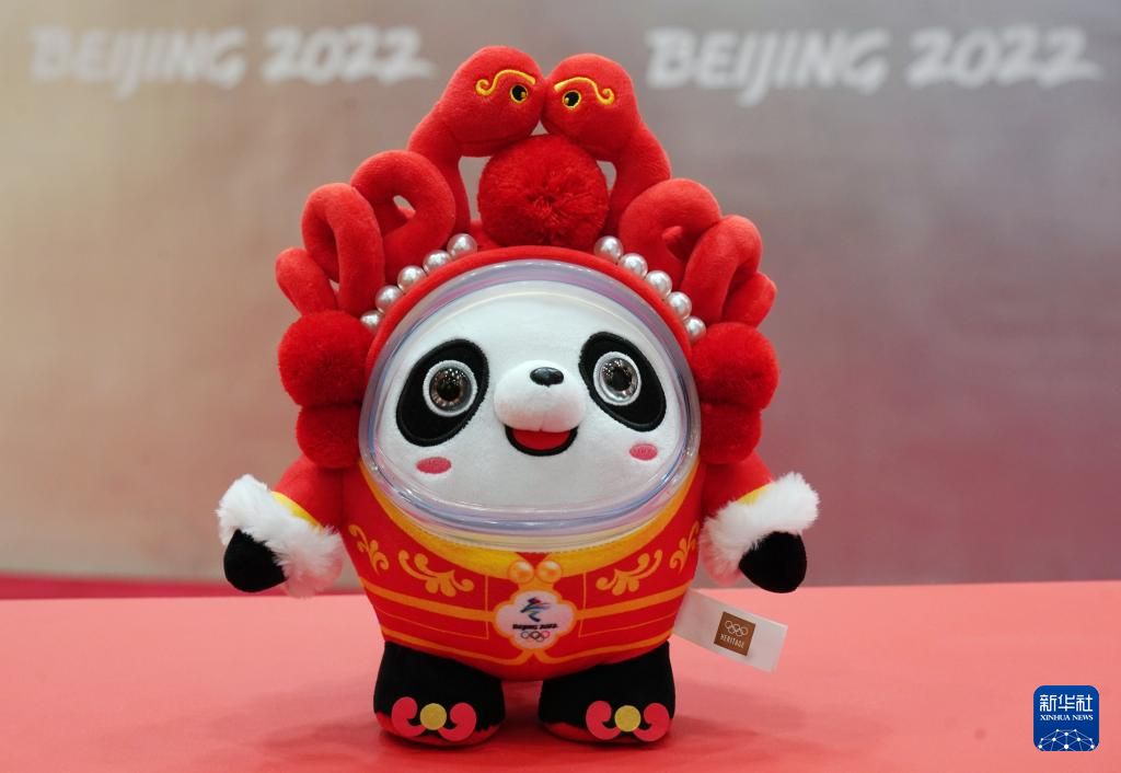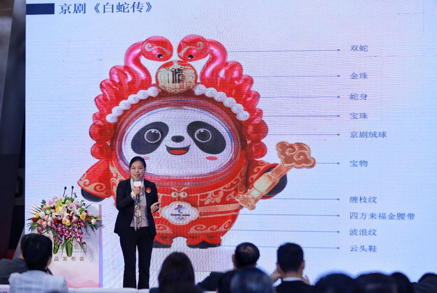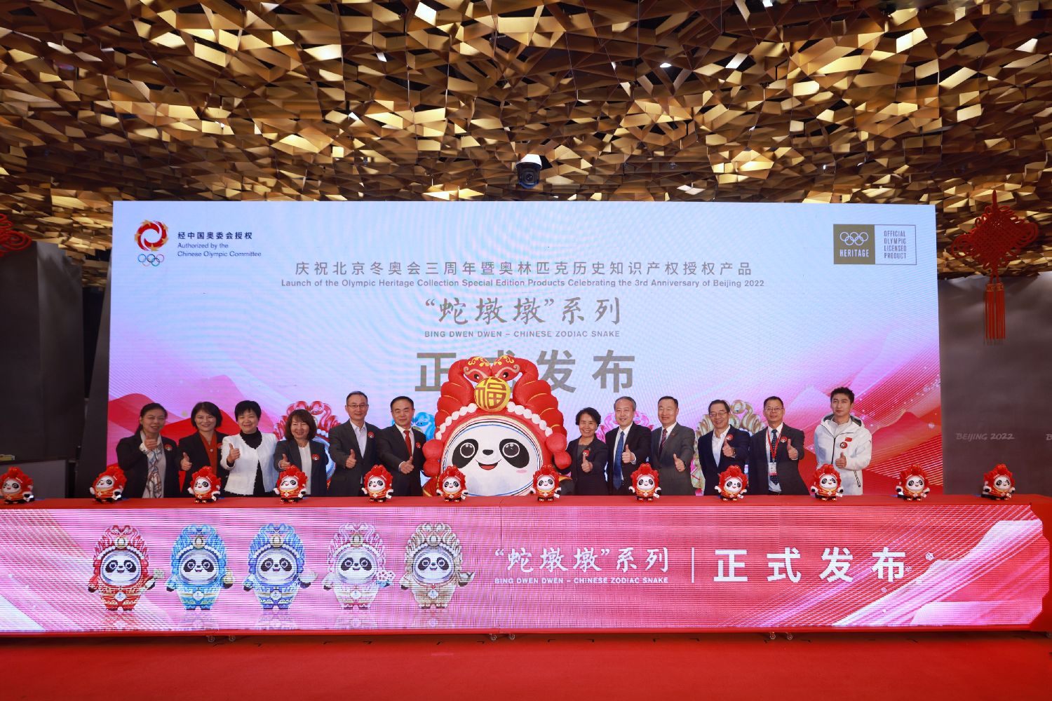 11月19日,庆祝北京冬奥会三周年暨奥林匹克历史知识产权授权产品——“冰墩墩”蛇年新春特别版“蛇墩墩”系列新品在北京发布。“蛇墩墩”以中国传统民间传说《白蛇传》为灵感来源,头部装饰以传统京剧中的“白娘子”和“小青”造型为蓝本,塑造了两条“蛇仙”,形态蜿蜒前进,在中心汇合,共同吐出“福禄寿喜财”金珠,表达“灵蛇献瑞”的吉祥喜庆氛围。两条灵蛇相互扶持与合作的形象,传递出团结与奋进的奥运精神。图为发布会现场展出的“蛇墩墩”系列新品。中新社
