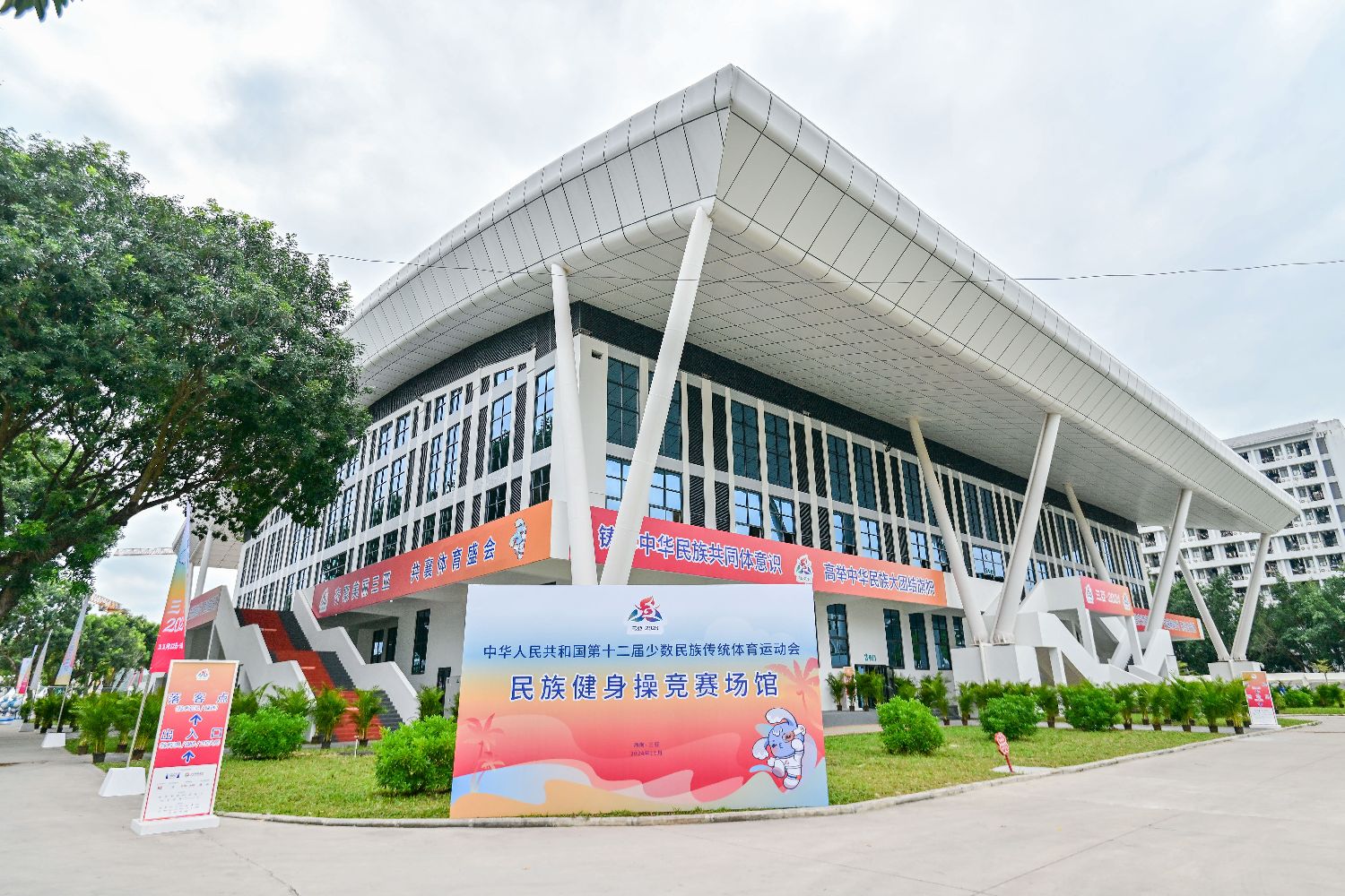 第十二届全国少数民族传统体育运动会将于11月22日在海南三亚开幕。目前,运动会各场馆场地布置均已准备就绪,三亚街头运动会氛围渐浓。图为11月19日的西南大学三亚中学体育馆,民族健身操项目的比赛将在此进行。中新社
