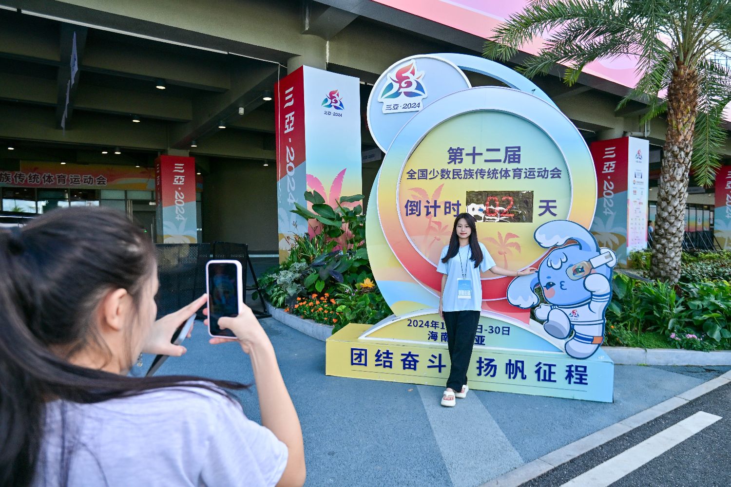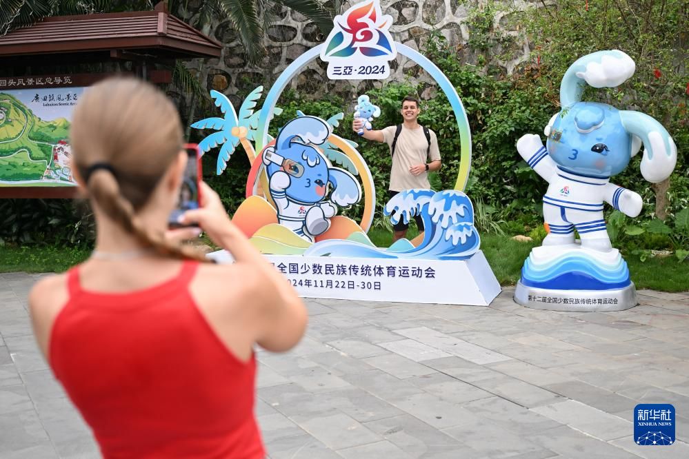 11月19日,游客在三亚鹿回头景区与运动会主题装饰合影。新华社