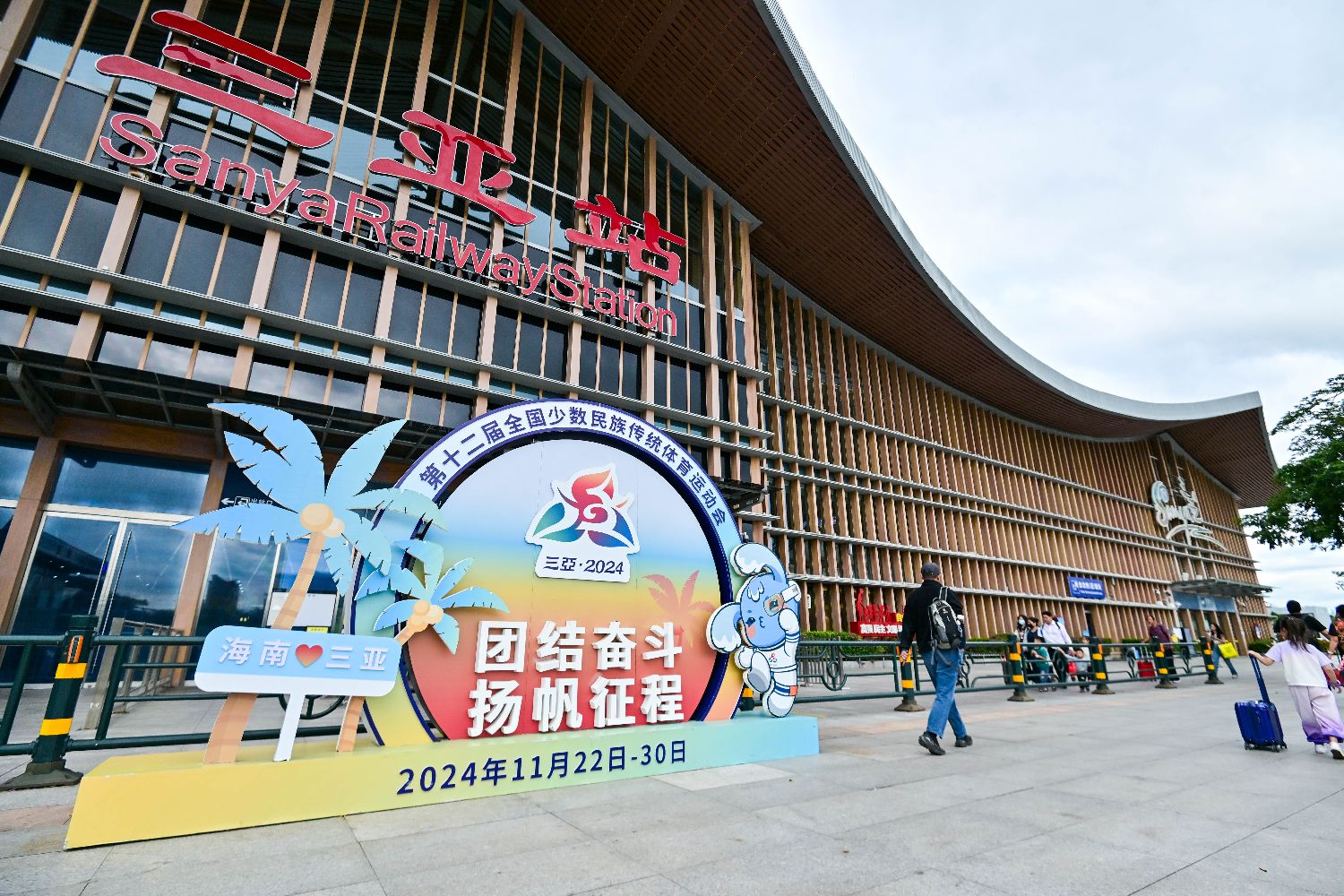 11月20日,三亚火车站前设置运动会主题宣传牌。中新社