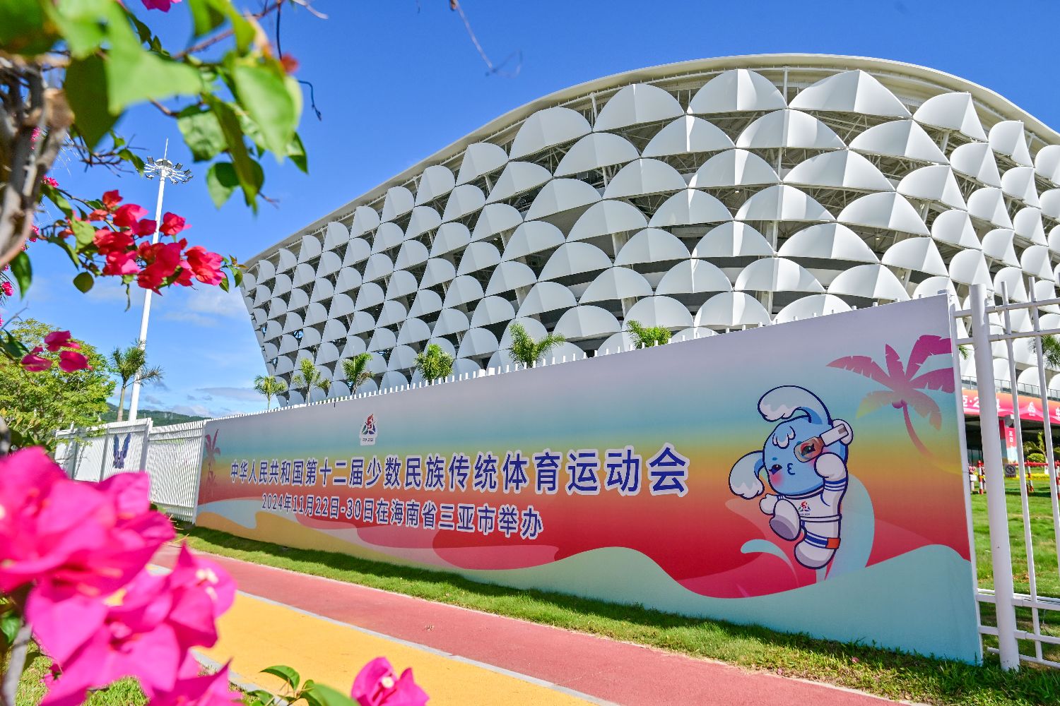 11月20日,三亚市体育中心外的运动会主题宣传牌格外醒目。中新社