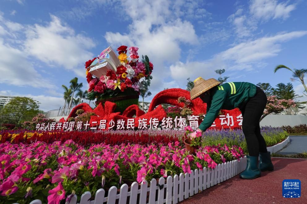 11月18日,工作人员在三亚街头的运动会主题花坛整理花卉。新华社