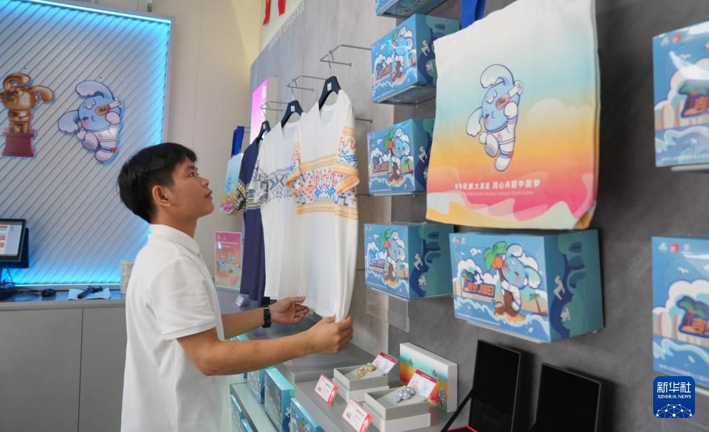 11月19日,工作人员在三亚鹿回头景区运动会特许商品店整理商品。新华社