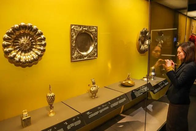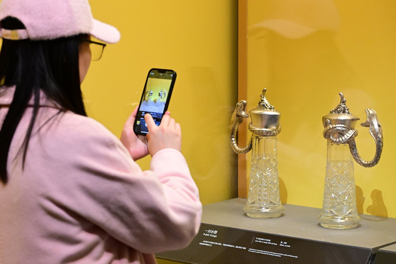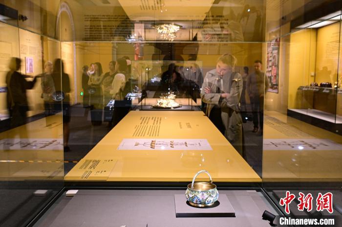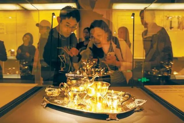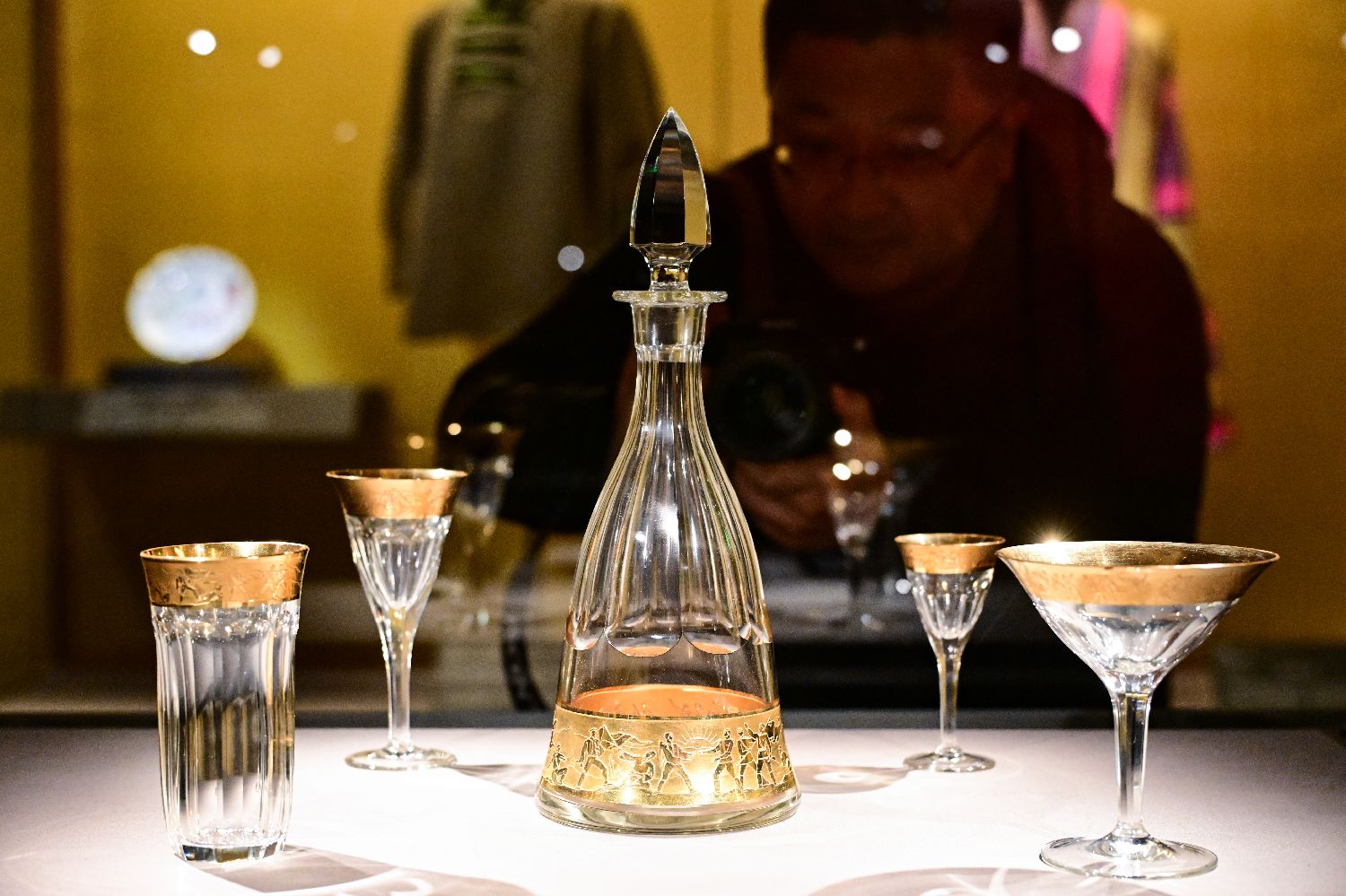 参观者在国博拍摄展出的酒具套装中的玻璃器皿。中新社
