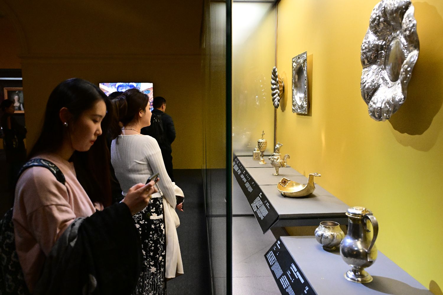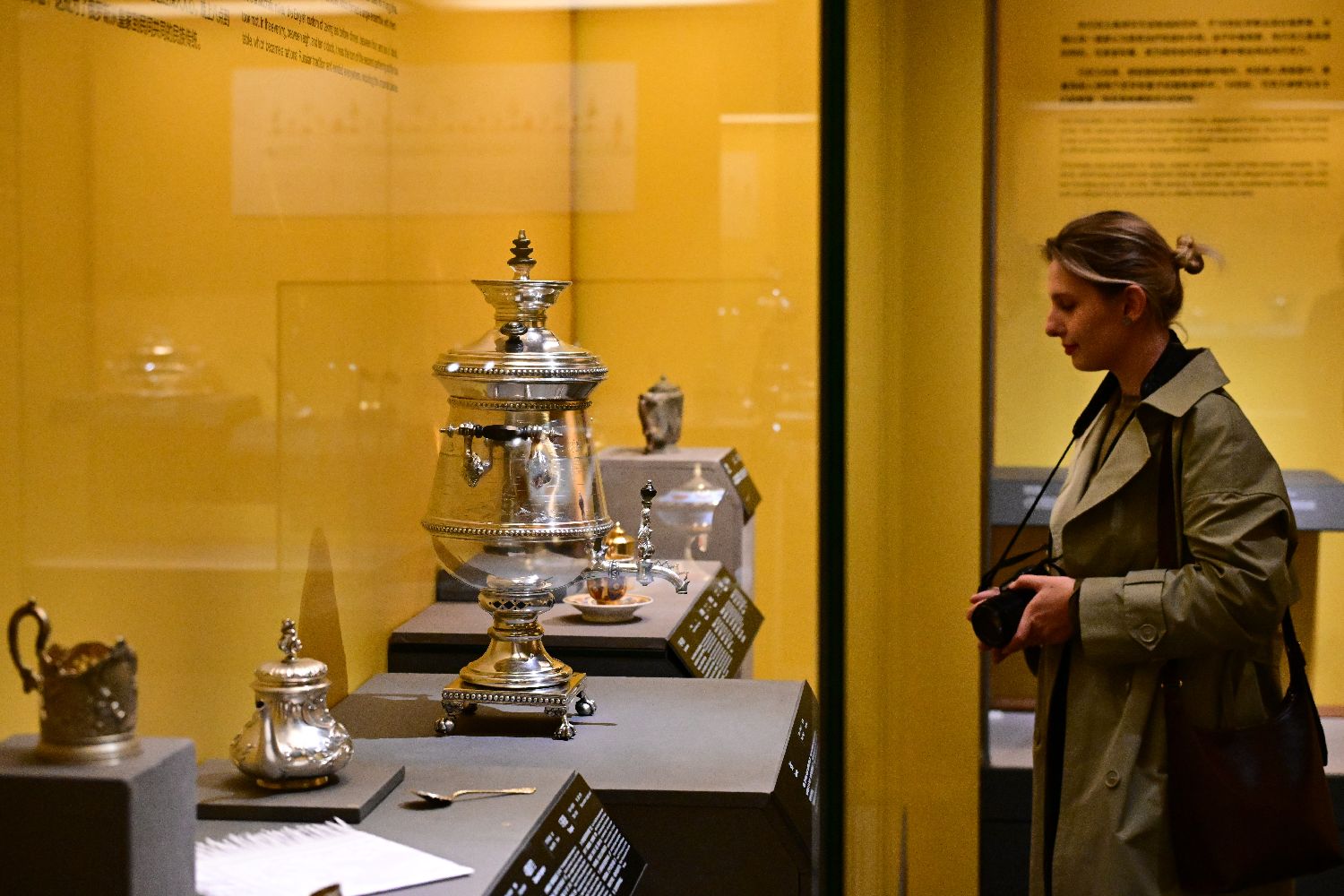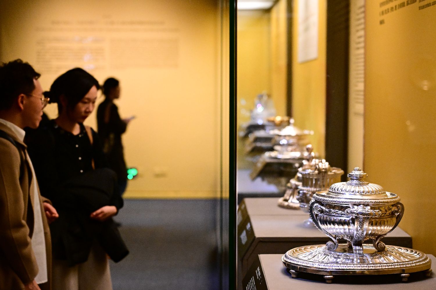 参观者在国博拍摄展出的酒具套装中的玻璃器皿。中新社