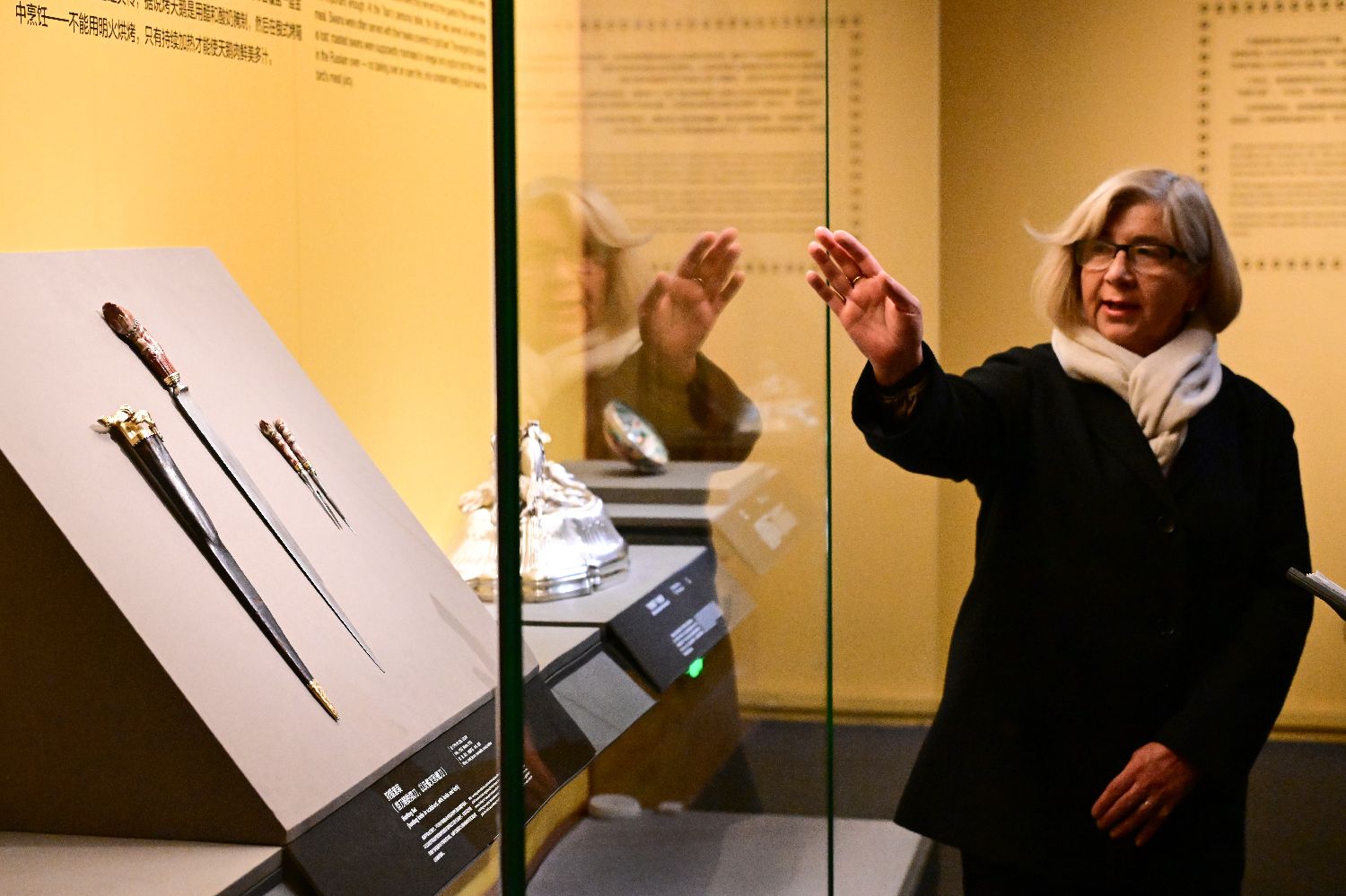 俄方策展人在国博为参观者介绍展品。中新社