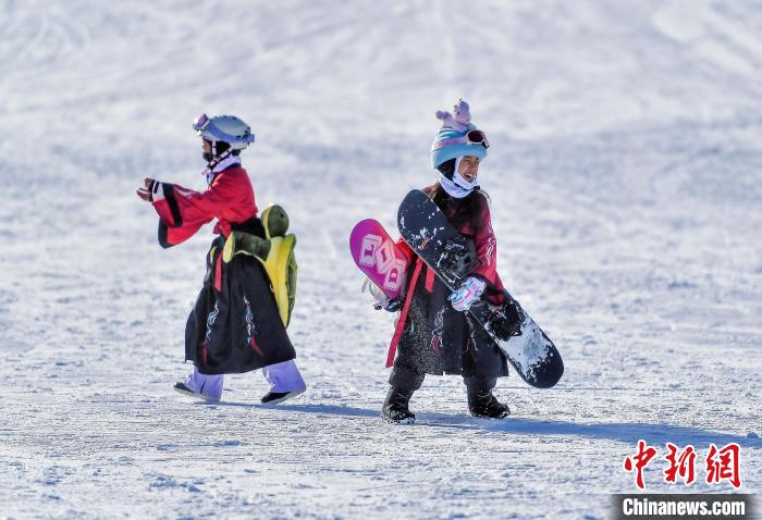 身穿传统服饰的小朋友,携滑雪装备参加首滑仪式。