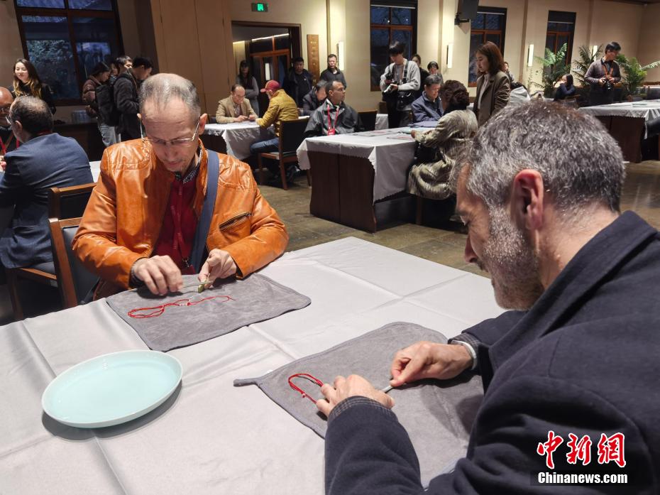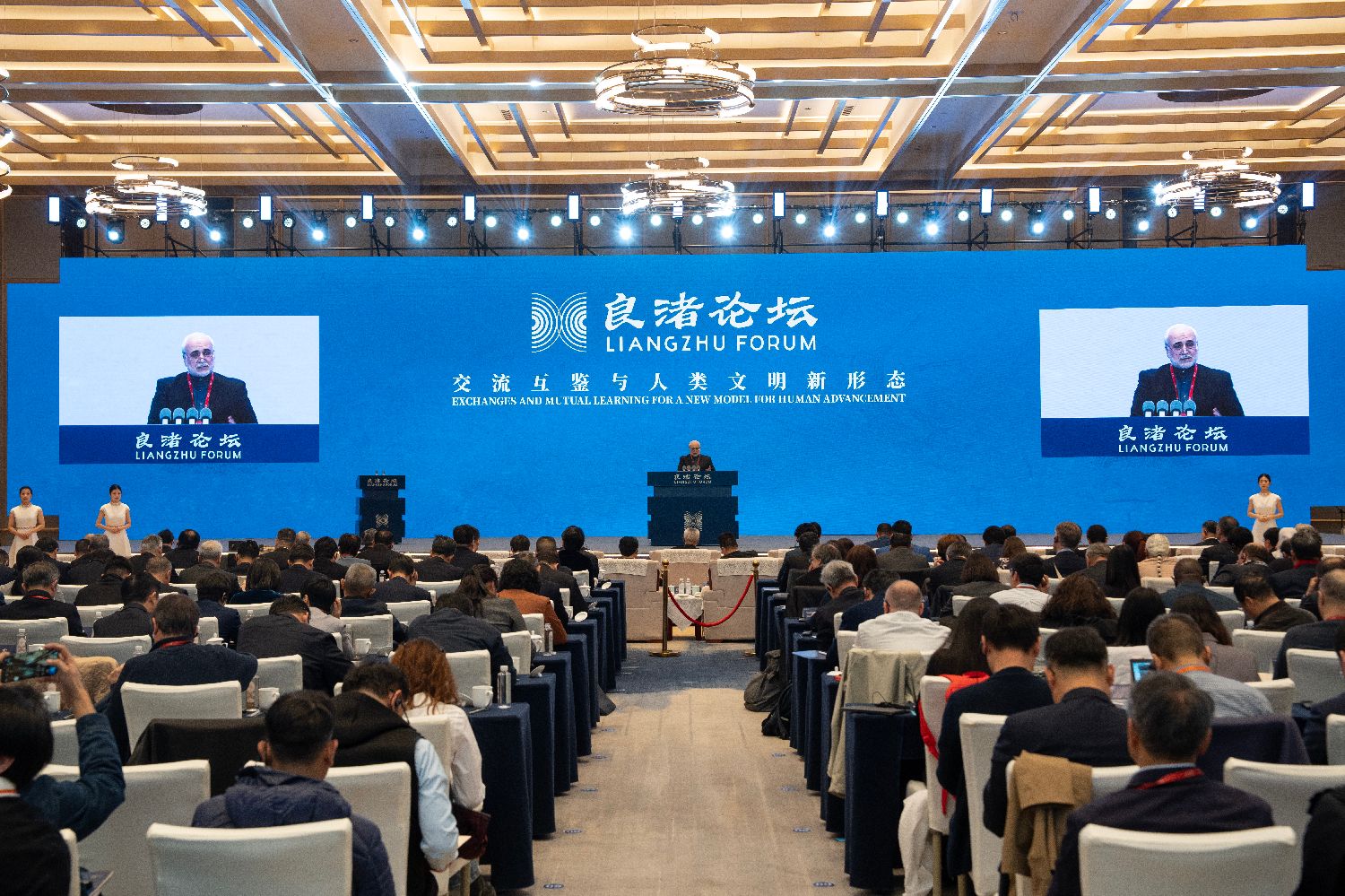 11月25日,以“交流互鉴与人类文明新形态”为主题的第二届“良渚论坛”在浙江省杭州市开幕,邀请来自60余个国家和地区的考古学家、作家、音乐家等300余名中外嘉宾参加。图为论坛现场。中新社
