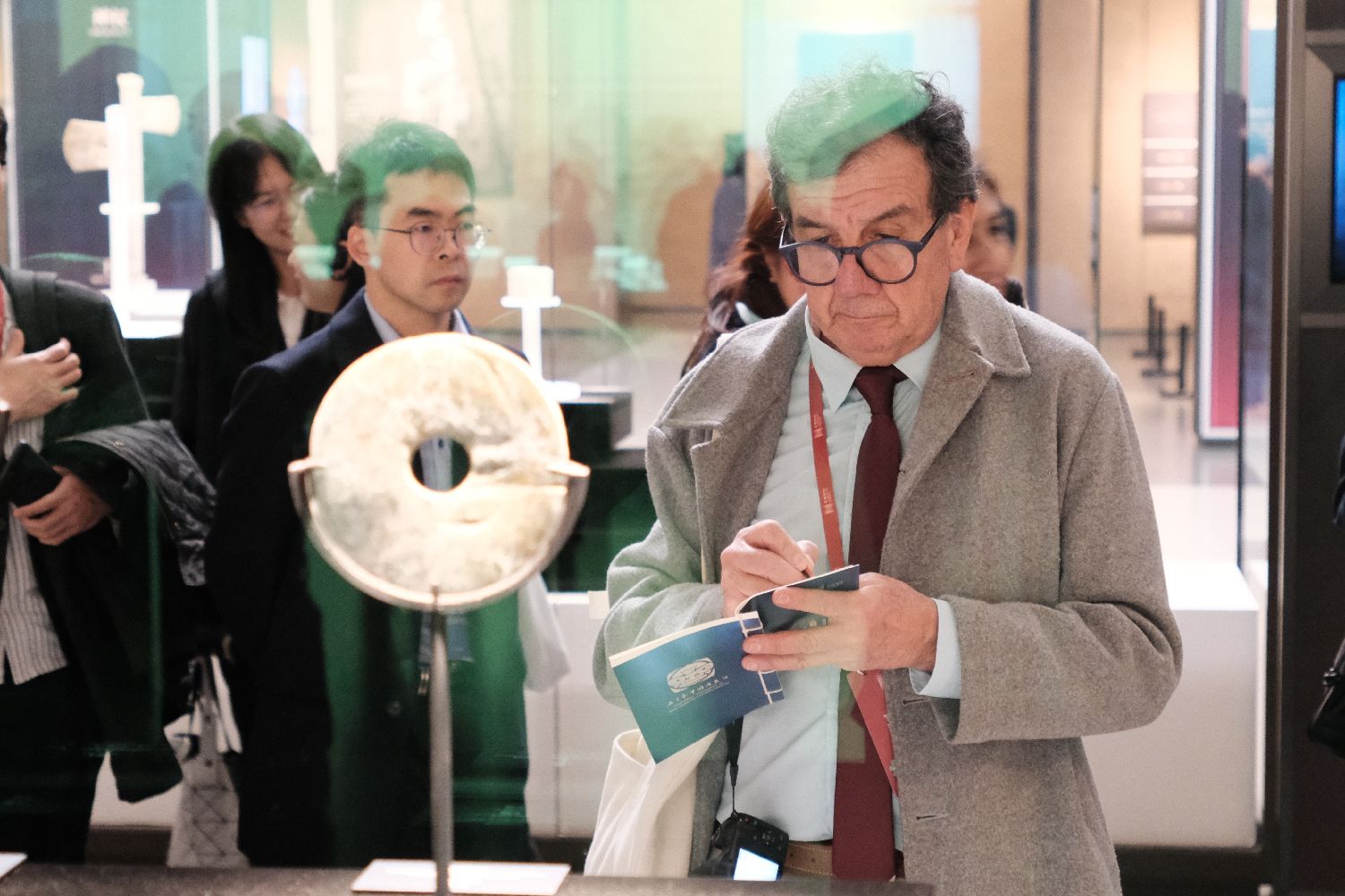 11月25日,考古学家在良渚玉璧前驻足细看。中新社