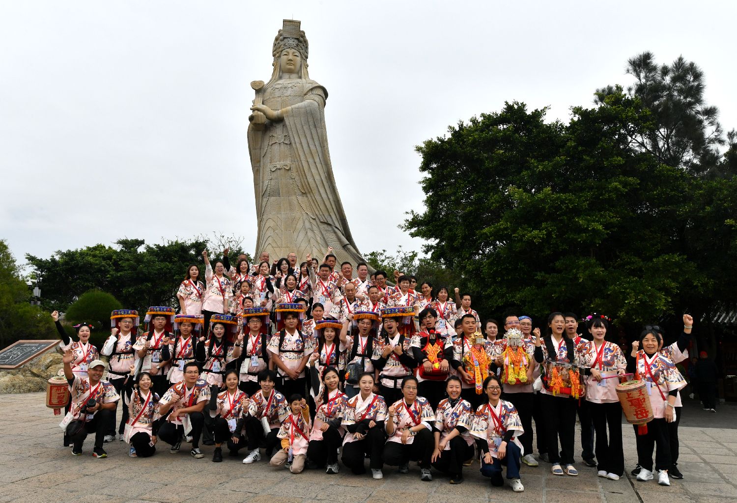 近日,逾120名两岸青年从福建泉州晋江东石天后宫出发,开启一场集民俗、交流、学习于一体的寻根之旅。图为11月25日,两岸青年在福建湄洲妈祖石雕像前合影。中新社