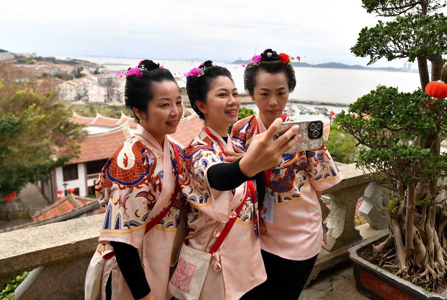 11月25日,在福建湄洲岛,几名台青梳完湄洲妈祖头后自拍。中新社