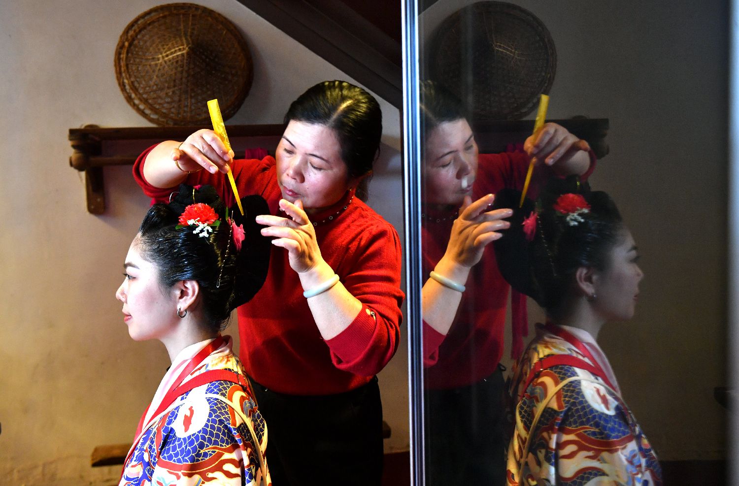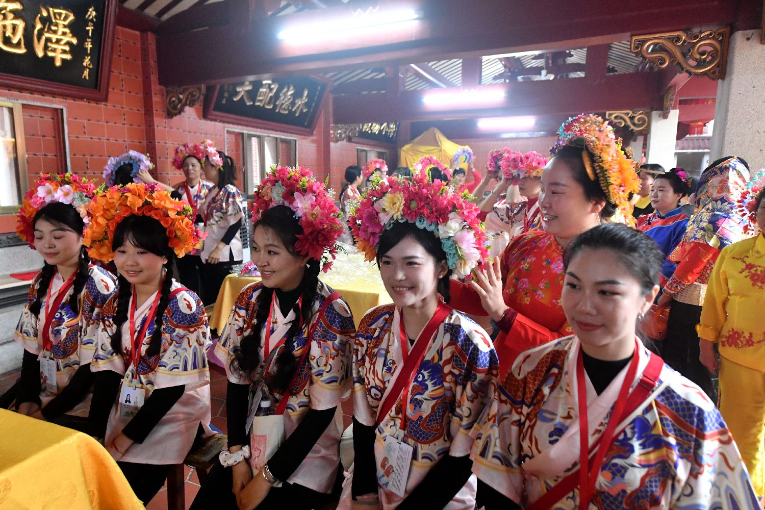 11月21日,两岸青年在泉州蟳埔顺济宫体验簪花。中新社