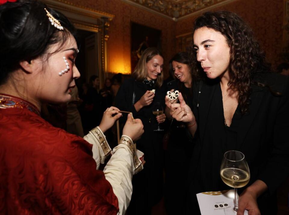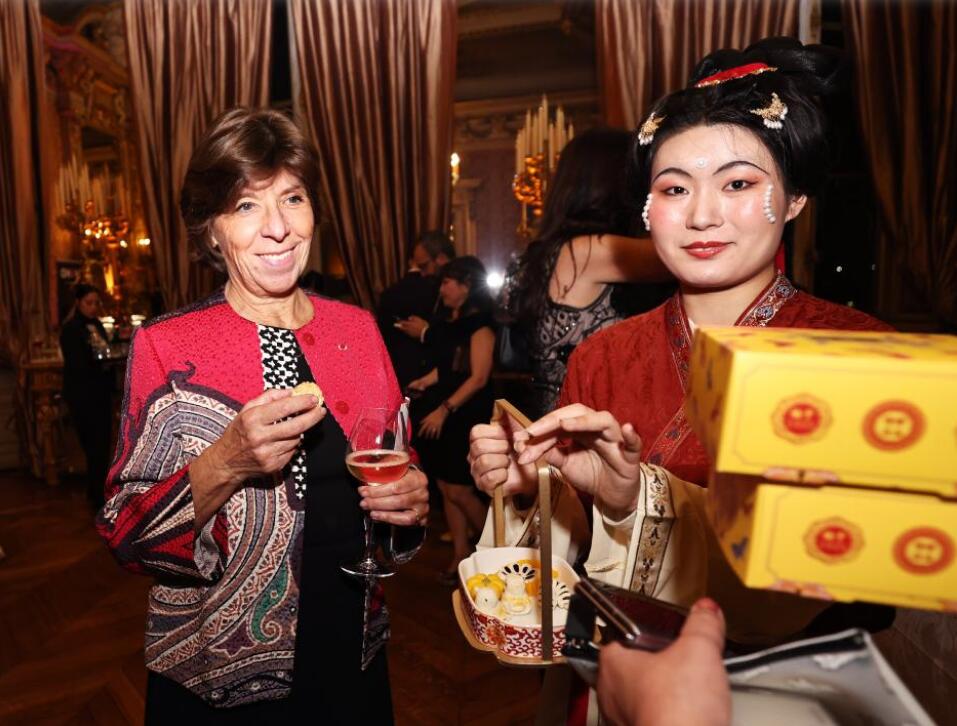 11月25日晚,法国LA LISTE国际美食2025年度排行榜在位于巴黎的法国外交部举行揭榜仪式。来自法国、葡萄牙、中国、韩国、日本等国的主厨在现场展示其独家美食。图为法国前外长卡特琳·科隆纳(左)品尝来自中国北京的百年宫廷“仿膳”名点。