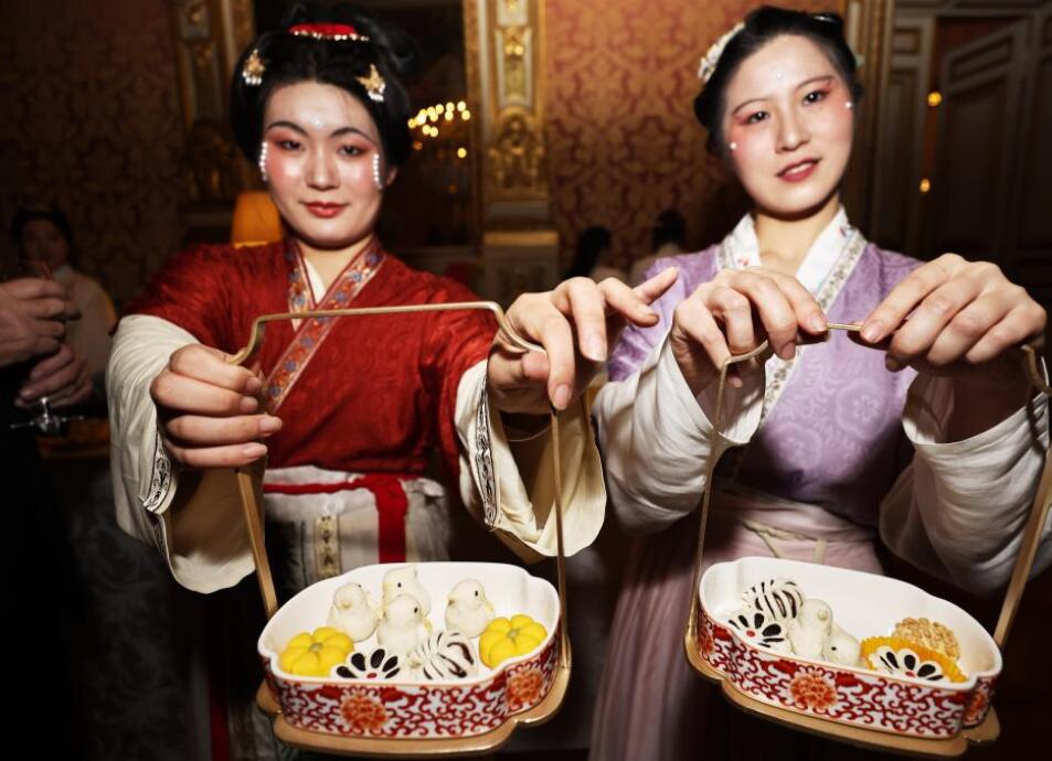 11月25日,身着中国传统服饰的工作人员展示来自中国北京的百年宫廷“仿膳”名点。