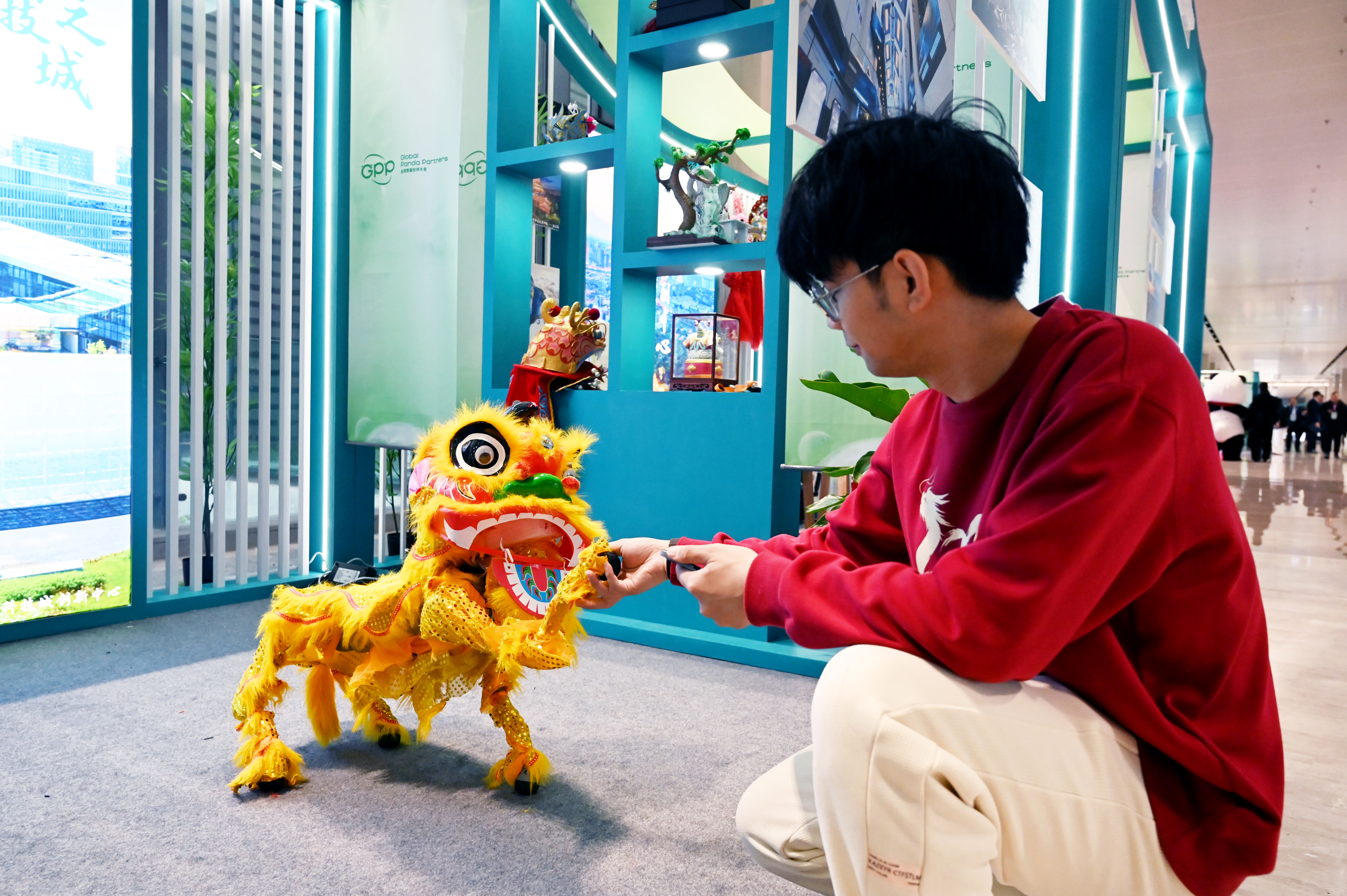 11月26日,参观者与“舞狮”机器人互动。中新社