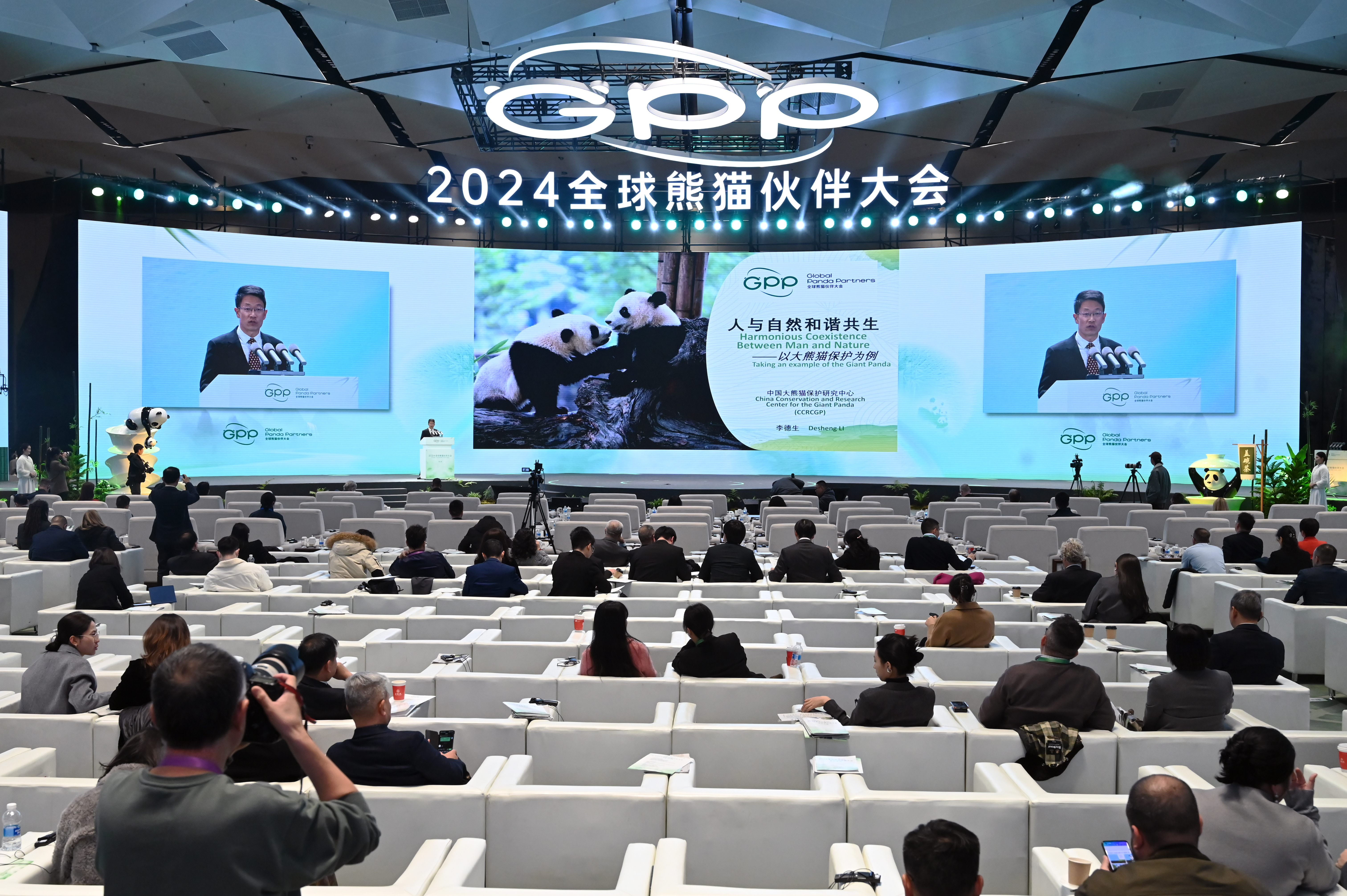 11月26日,2024全球熊猫伙伴大会在成都举行。大会以“人与自然和谐共生”为主题,来自世界各地的大熊猫及野生动物保护专家、驻华使领馆官员、地方政府代表、关爱大熊猫人士和绿色发展实践企业等多领域的熊猫伙伴,共同奔赴大熊猫故乡——四川成都,共论绿色发展新探索,共倡生态文明新未来。图为中国大熊猫保护研究中心副主任、首席专家李德生在大会上作主旨演讲。中新社