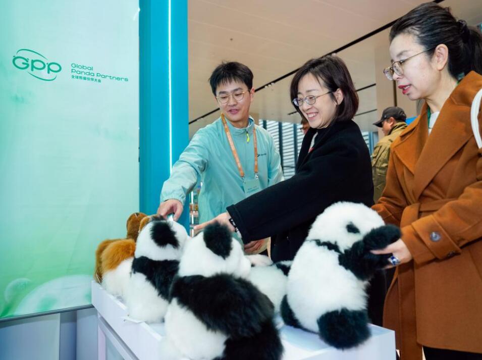 11月26日,嘉宾在会场观看大熊猫玩偶。新华社