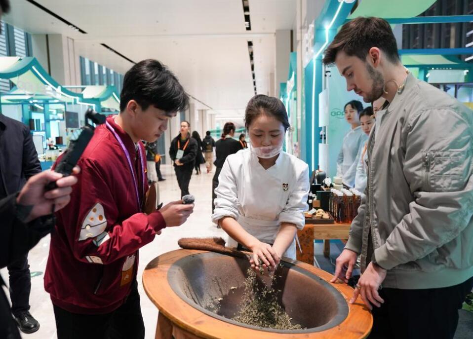 11月26日,在2024全球熊猫伙伴大会会场,外国嘉宾了解雅安茶制作工艺。新华社
