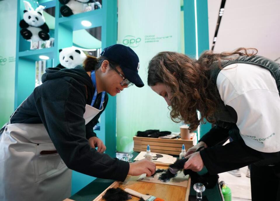 11月26日,嘉宾在2024全球熊猫伙伴大会会场体验制作大熊猫玩偶。新华社