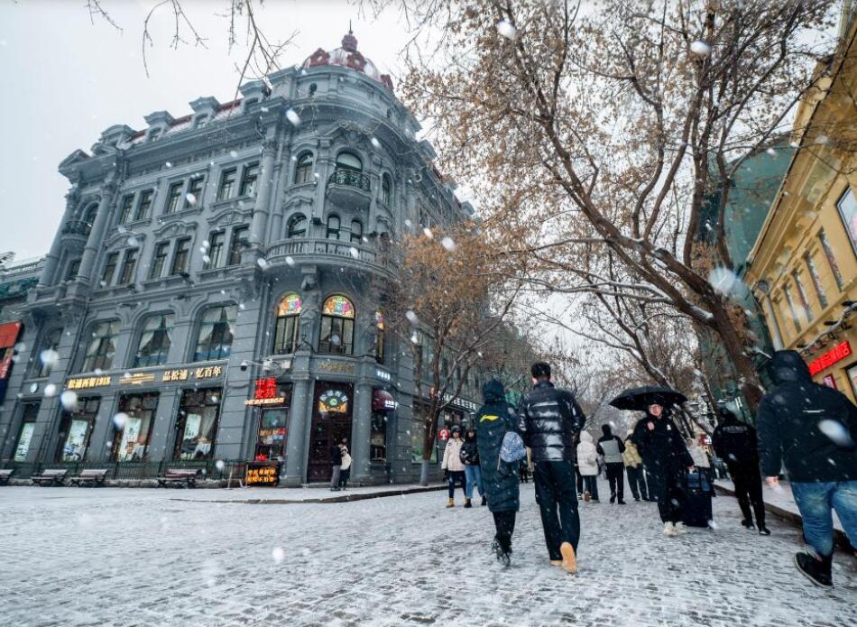 11月26日,黑龙江哈尔滨和吉林长春迎来今冬首场明显降雪天气,两座城市披上银装。图为市民游客在雪中的哈尔滨中央大街步行街行走。新华社