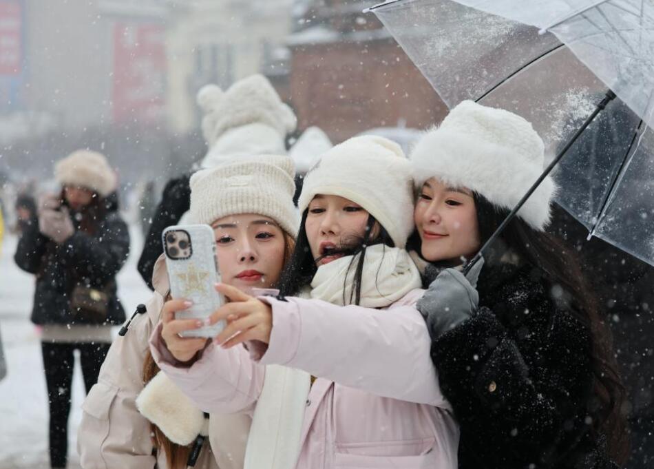11月26日,游客在哈尔滨建筑艺术广场雪中留影。新华社