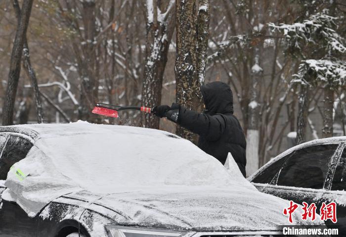 11月26日,长春市民在清扫车上的积雪。中新网