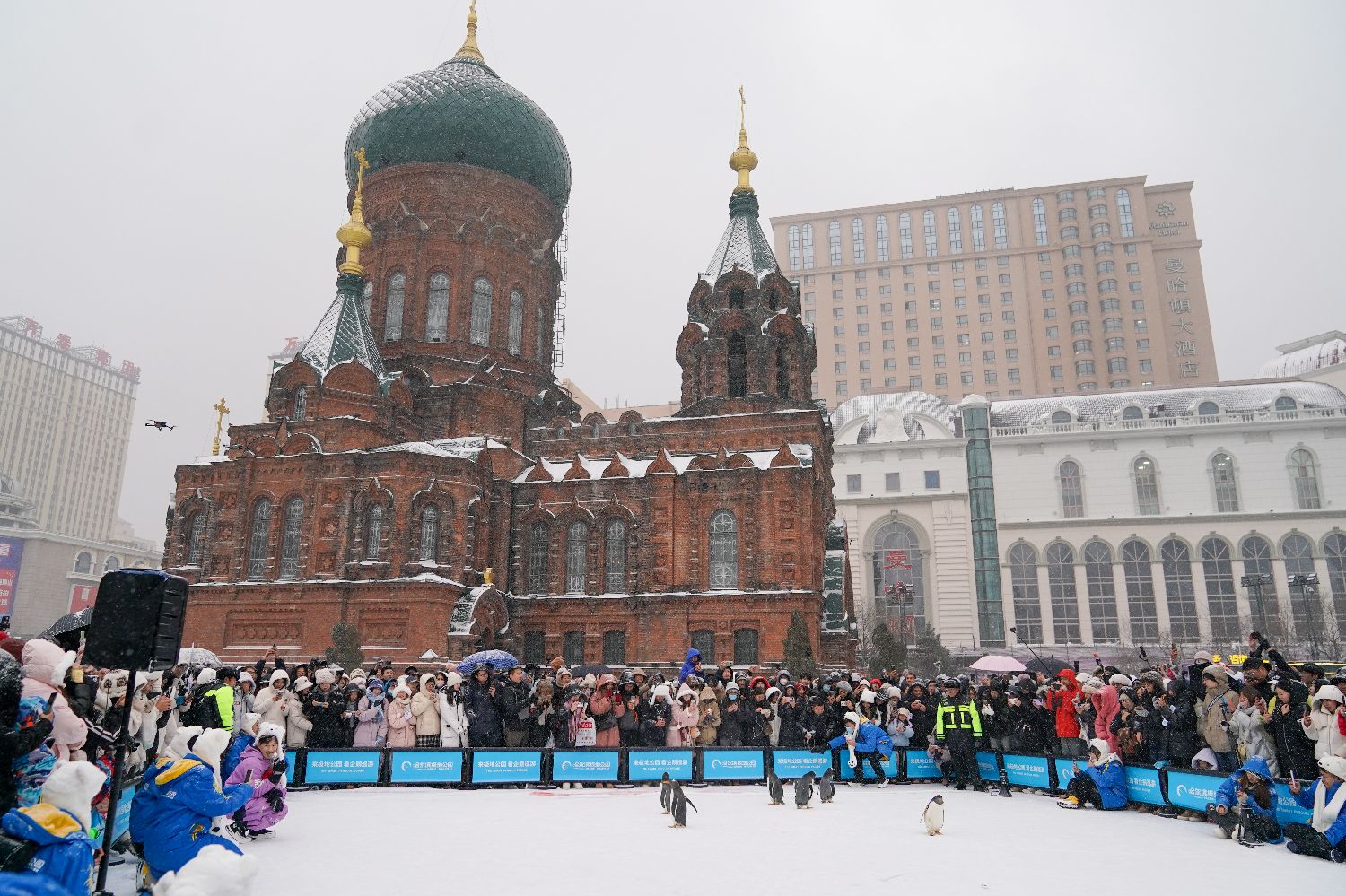 11月26日,哈尔滨极地公园的原创文旅IP“淘学企鹅”开启今冬冰雪季首次外出“打卡”,10只企鹅迈着小碎步来到哈尔滨地标建筑索菲亚教堂,召开首场巡游“粉丝见面会”。图为企鹅与索菲亚教堂同框。中新社