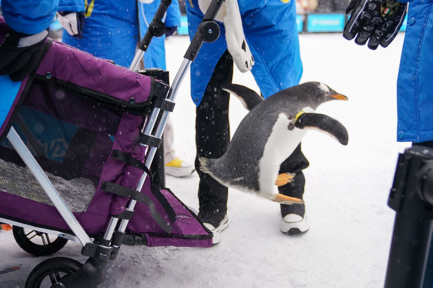 11月26日,哈尔滨极地公园的原创文旅IP“淘学企鹅”开启今冬冰雪季首次外出“打卡”,10只企鹅迈着小碎步来到哈尔滨地标建筑索菲亚教堂,召开首场巡游“粉丝见面会”。图为企鹅跳下“保姆车”。中新社
