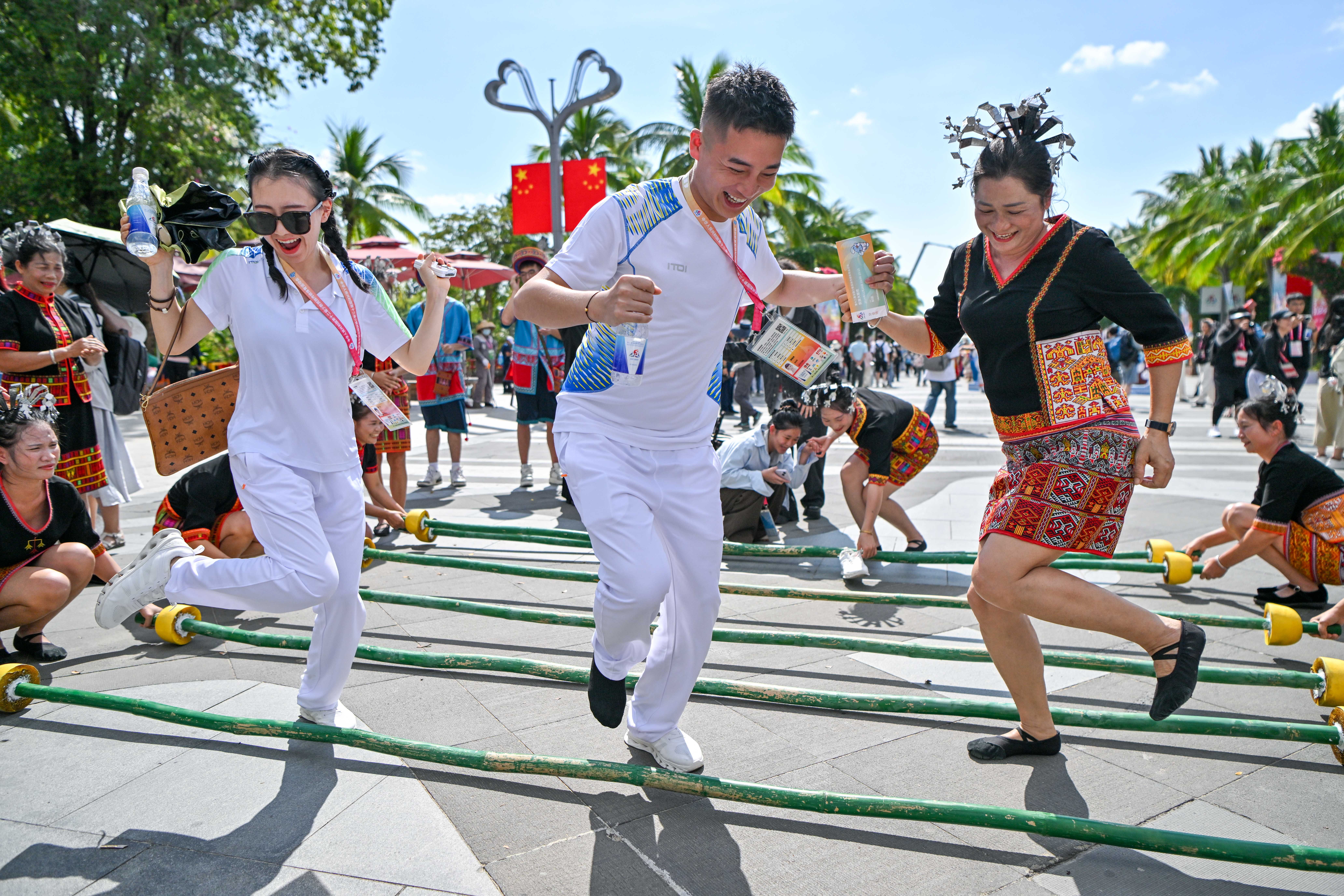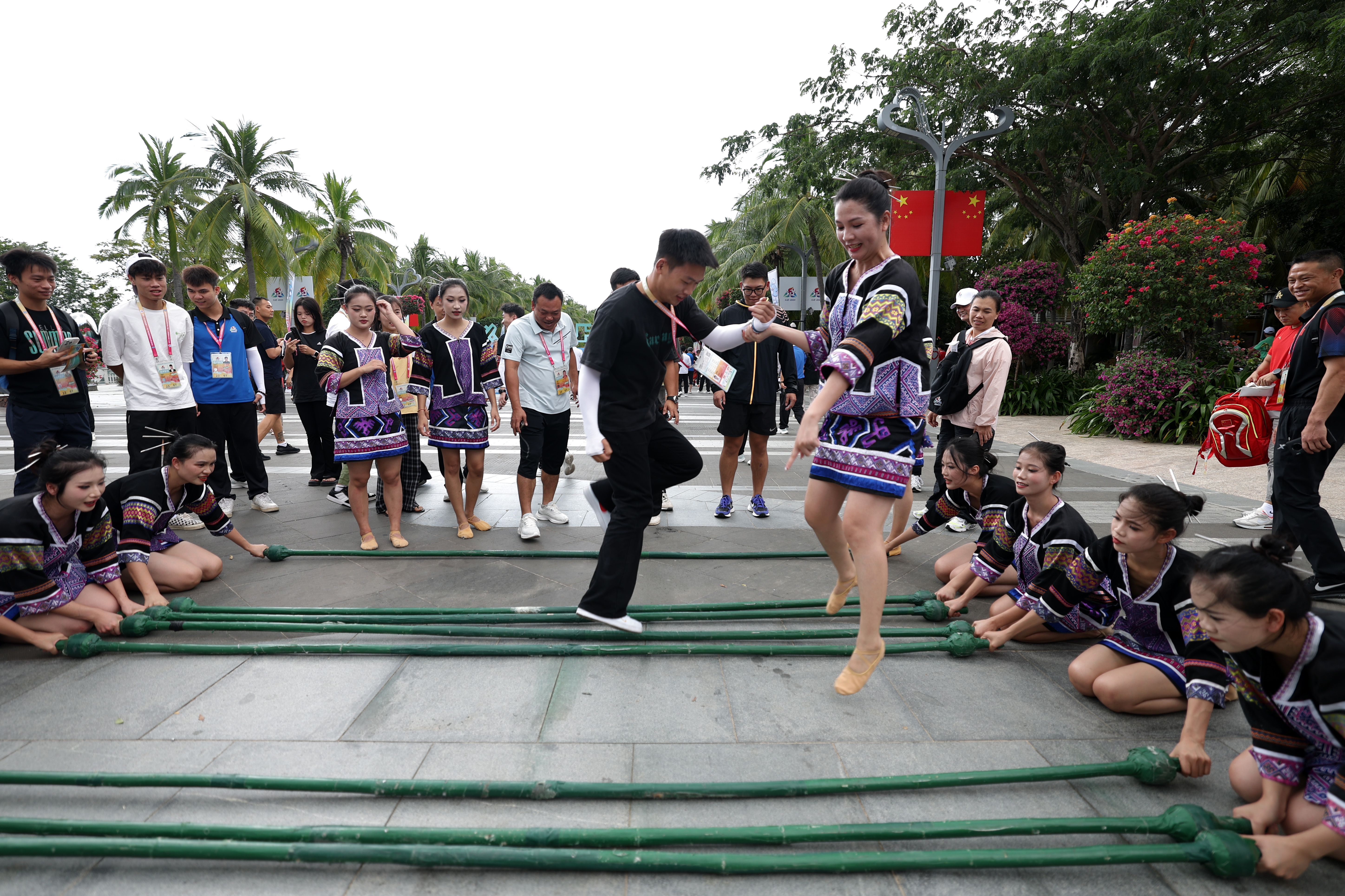 11月26日,第十二届全国少数民族传统体育运动会民族大联欢活动在海南省三亚市举行。图为运动员在欢迎仪式上与黎族演员同跳竹竿舞。中新社