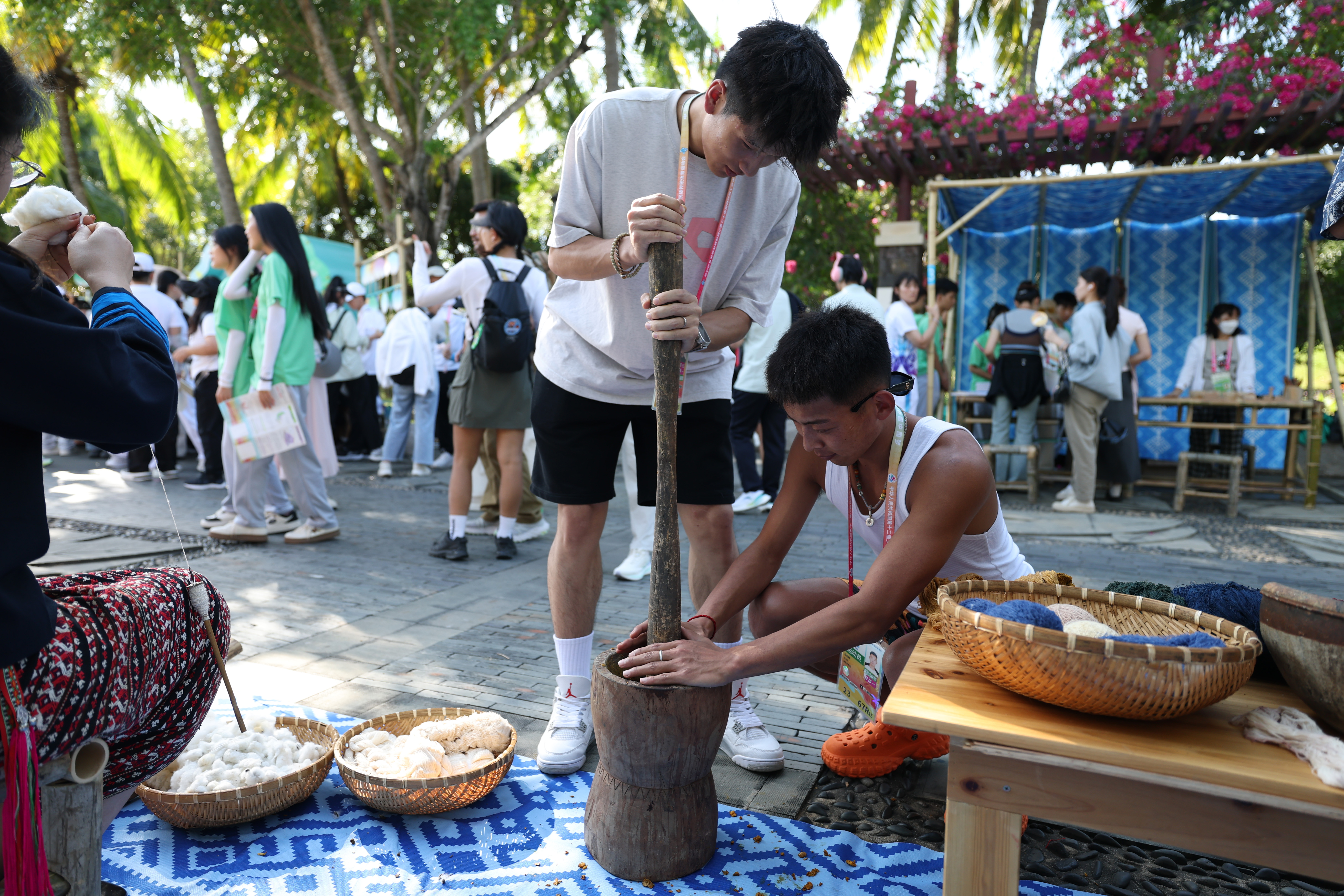 11月26日,演职人员带领运动员跳竹竿舞。中新社