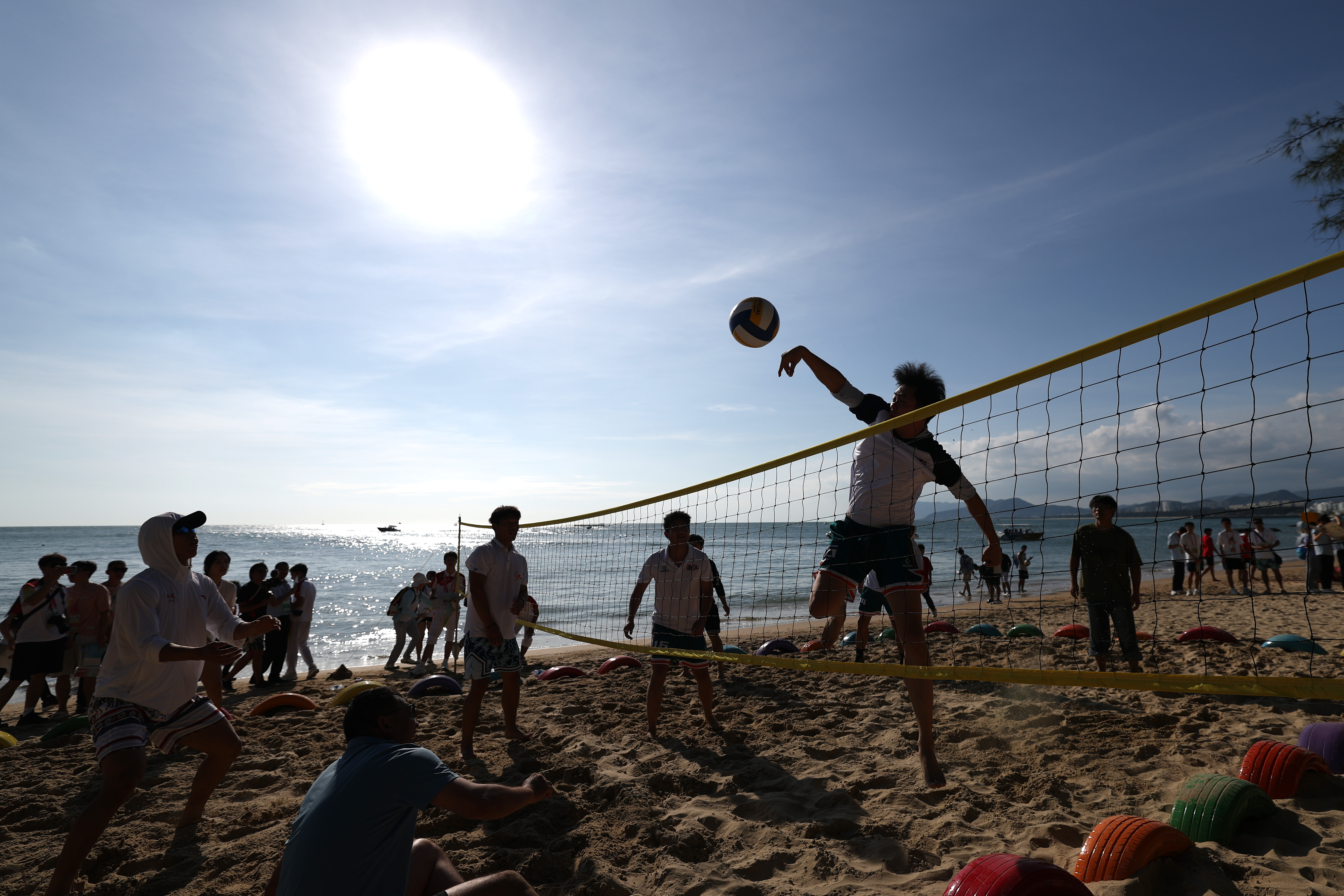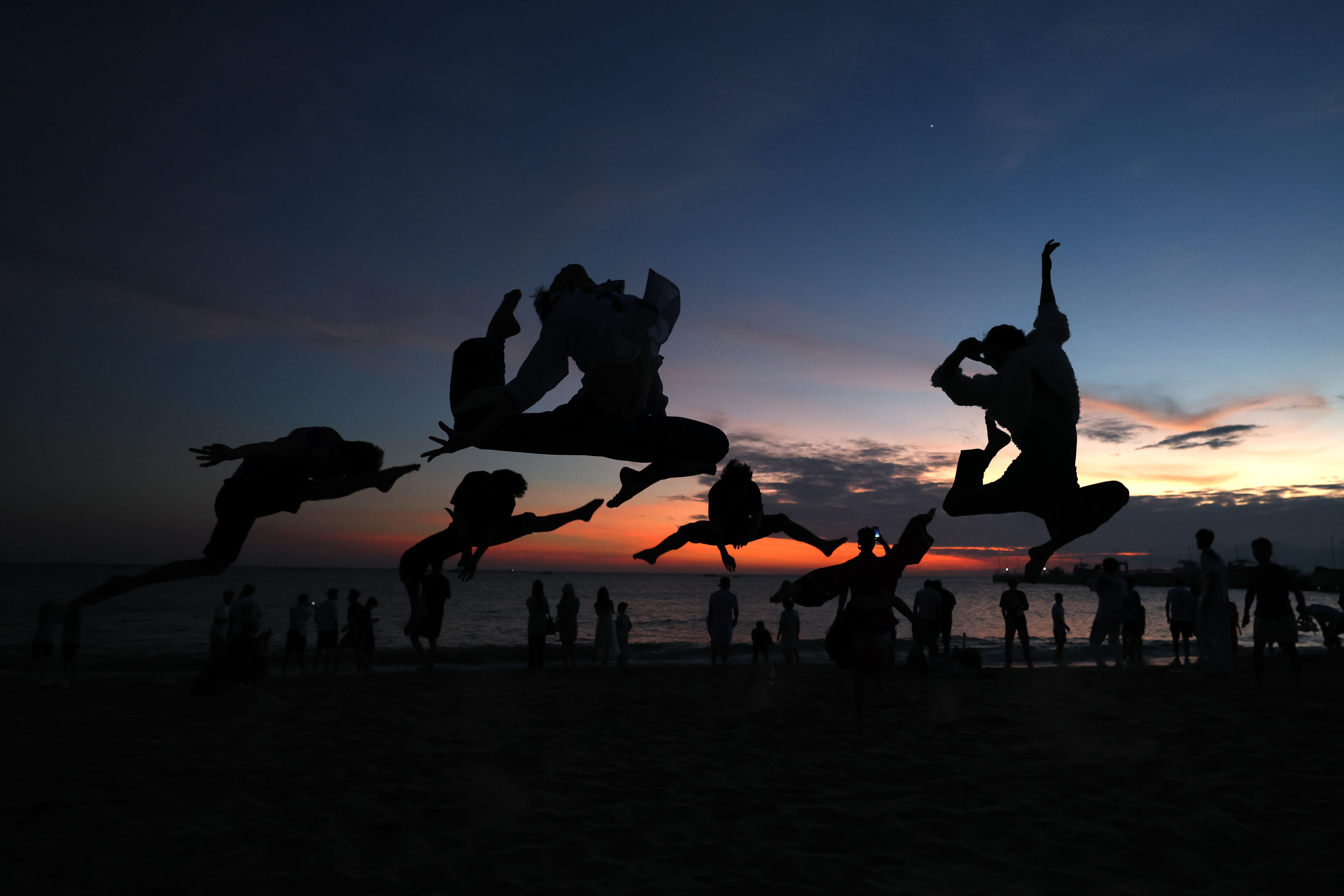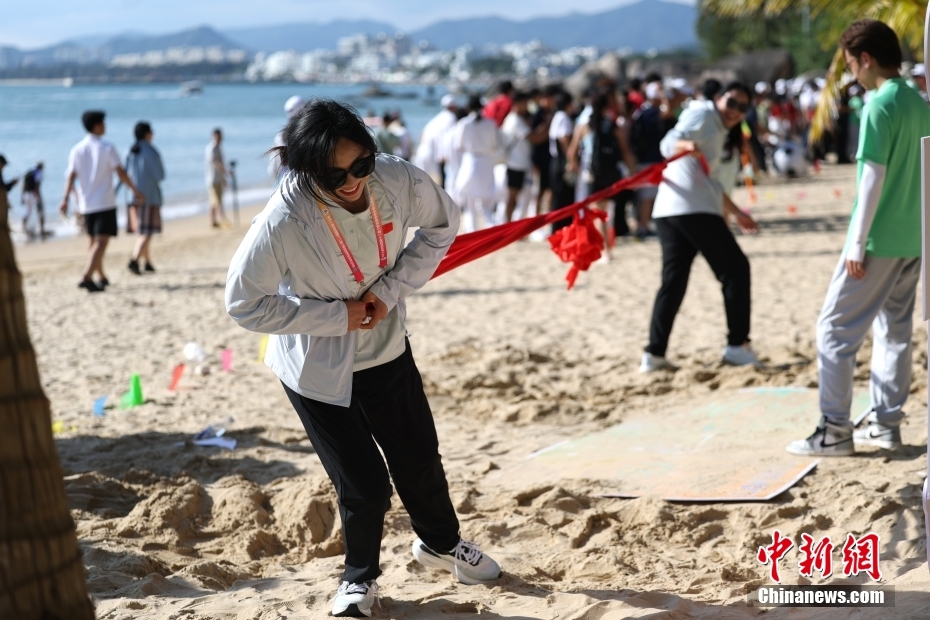 11月26日,云南代表团运动员在海边跳舞。中新社