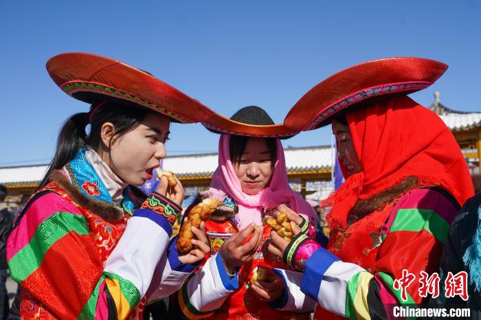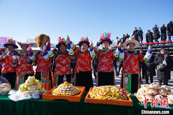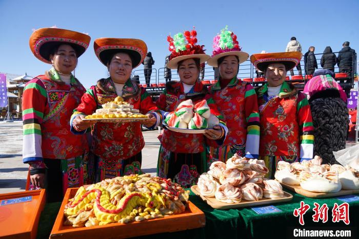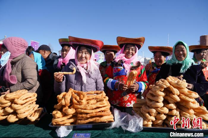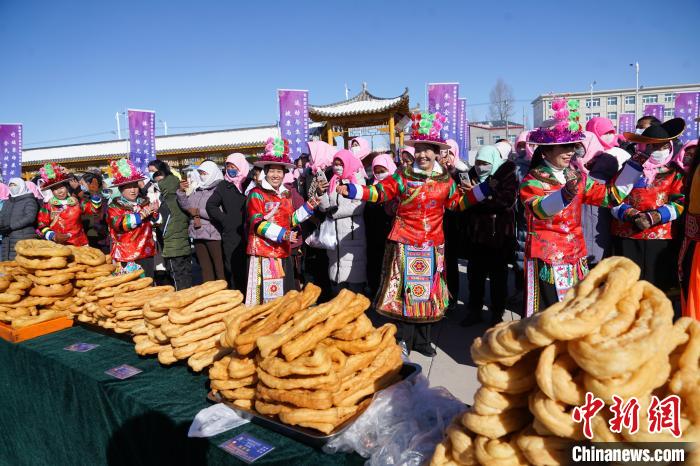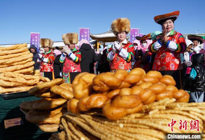 11月26日,土族民俗传统馍馍比赛在高原“土乡”——青海省海东市互助土族自治县举行,129名巧手厨娘各显身手,制作出炸馓子、“翻跟头”、焜锅馍馍、“背口袋”、花卷等焜、炸、烙、蒸四大系列共十个品种的土族传统馍馍“佳作”,引众多民众品尝了解。图为比赛现场展出的土族民俗传统馍馍。