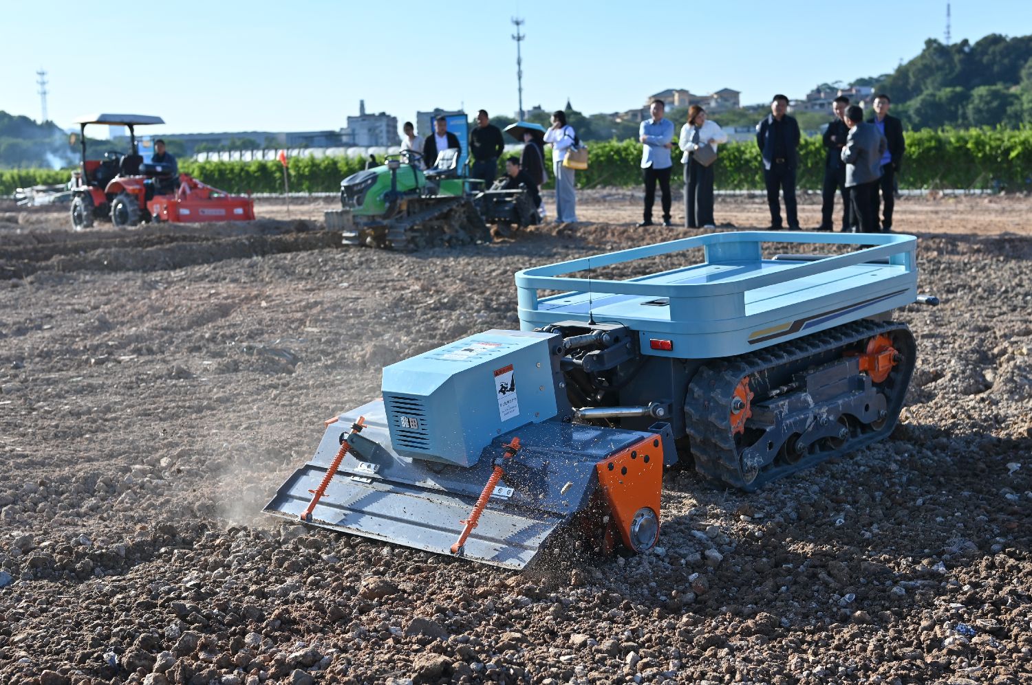 11月28日,第二十一届中国国际农产品交易会(下称农交会)在广东广州开幕,哈萨克斯坦为主宾国。中国农交会是中国农业农村领域规模最大的综合性展会。今年中国农交会首次走进粤港澳大湾区,与广东现代农业博览会同期举办。展会为期4天,同期还举办2024全国脱贫地区“土特产”走进大湾区推介周暨全国农产品采购商联盟成立、农业品牌成果发布与推介等重要活动及30多场品牌推介活动。图为在隆平院士港举行的第二十一届中国国际农产品交易会现代农机展演示活动上,新能源电动履带式旋耕机工作中。中新社