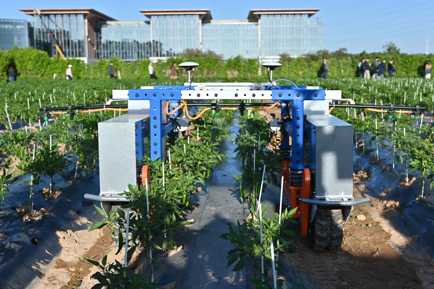第二十一届中国国际农产品交易会现代农机展演示活动上,现代农机展演示活动上的无人车在田间进行喷淋工作。中新社