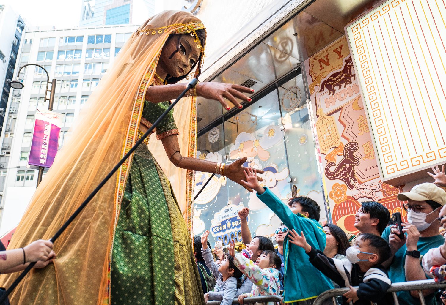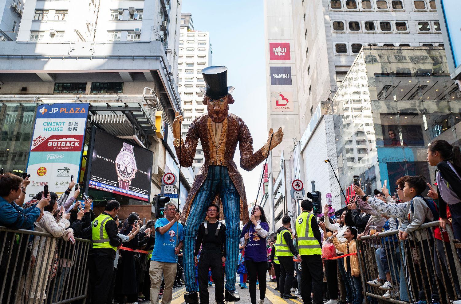 12月1日,儒勒·凡尔纳著名科幻小说《八十天环游地球》中的主角人物巨型木偶在香港维多利亚公园至铜锣湾街头进行巡游表演,令沿途市民游客享受轻松愉快的周末时光。该巡游是香港青年艺术协会主办的“渣打艺趣嘉年华”的压轴大戏。图为小说男主角福克先生形象的木偶与两旁的市民游客互动。中新社