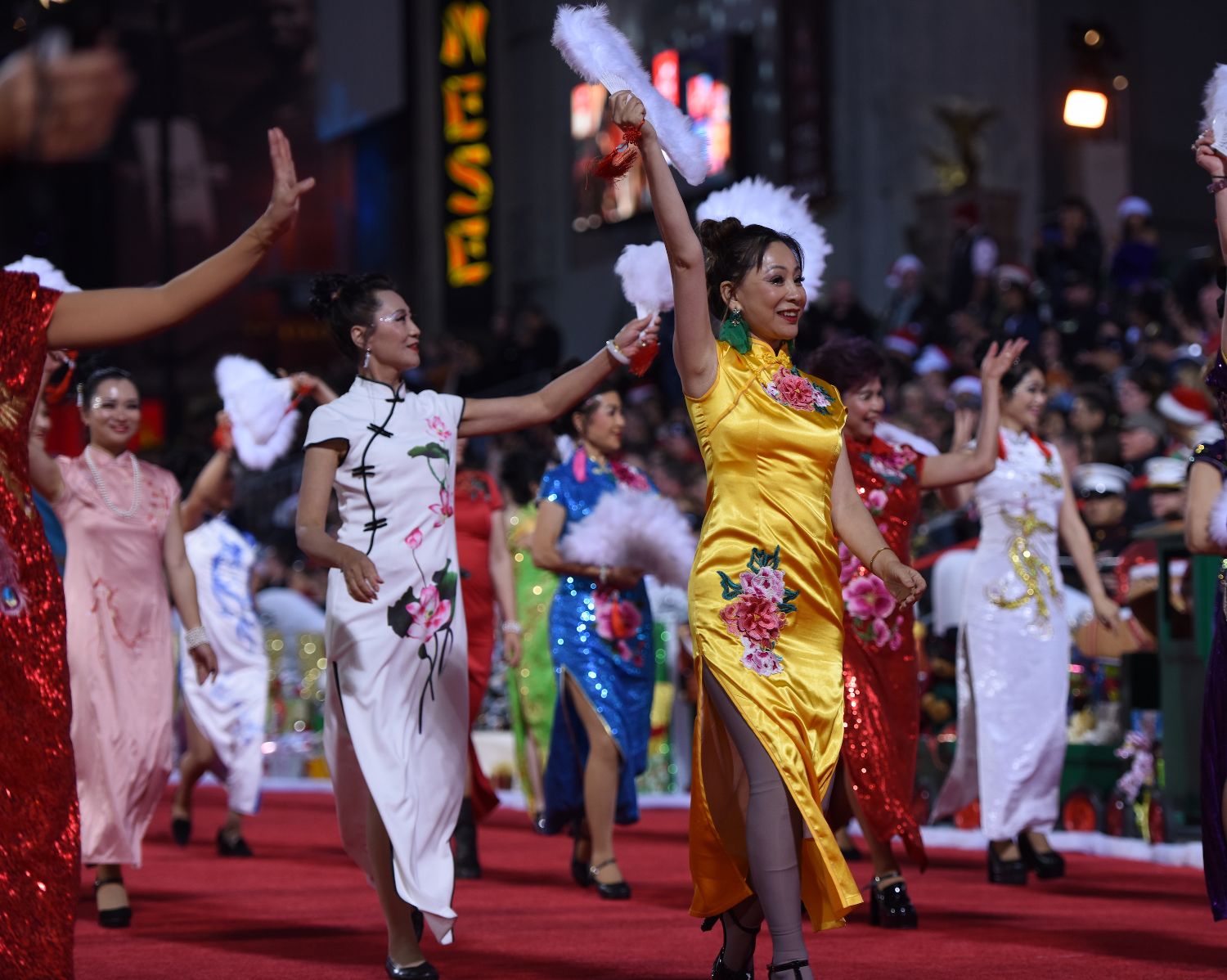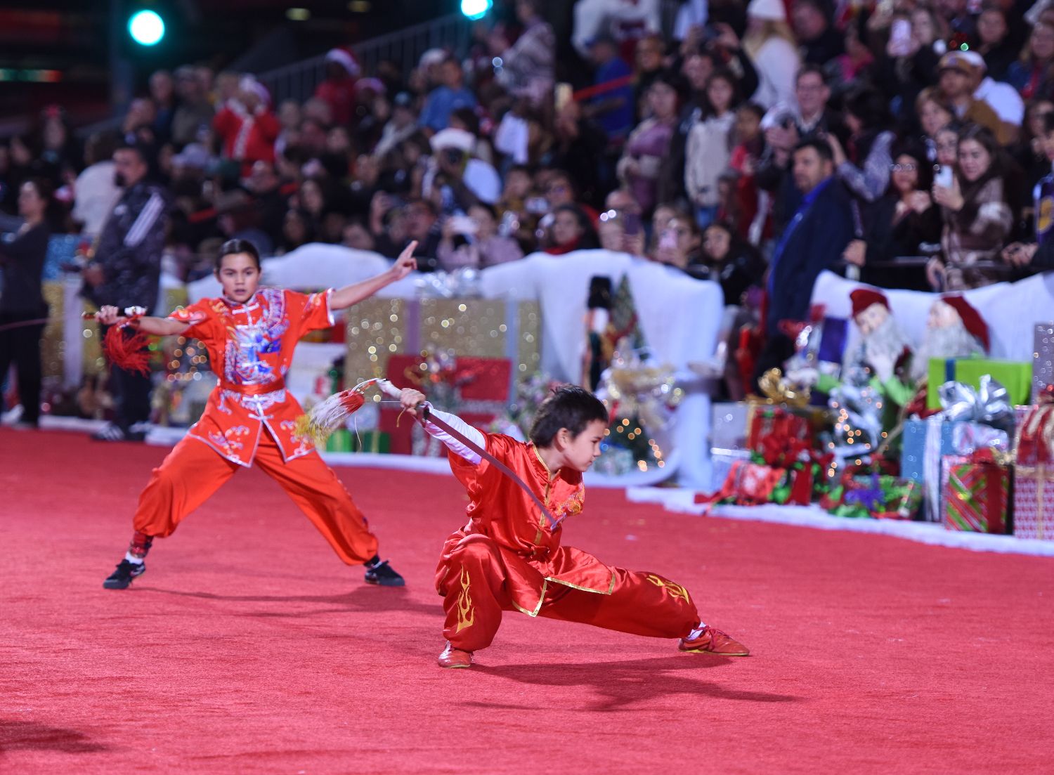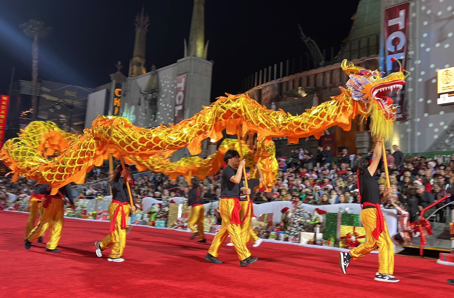 当地时间12月1日,第92届好莱坞圣诞大游行在美国洛杉矶星光大道欢乐登场。逾200名当地华侨华人带来舞龙舞狮、武术和旗袍秀等表演。图为舞龙表演。