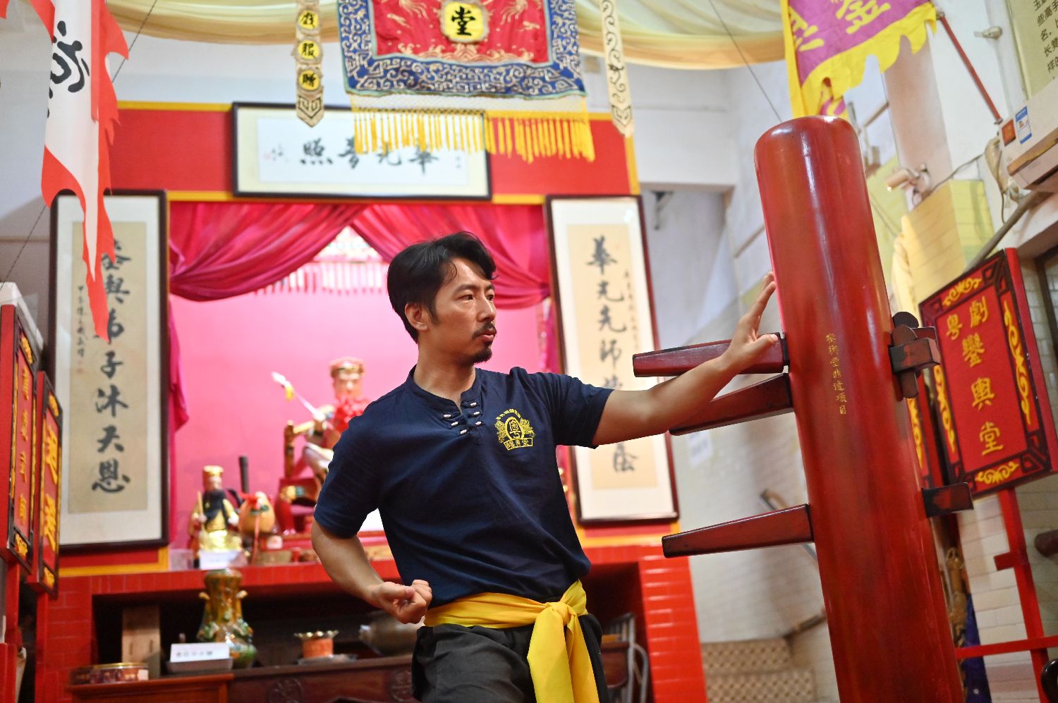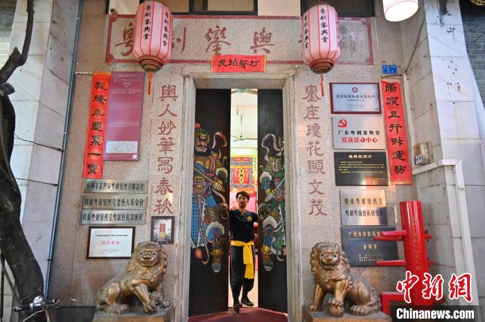 出身澳门武术世家的李健豪,自幼跟随叶问第二代传人谭锦兴学习咏春拳。痴迷于中国武术的他,对咏春拳的来源兴趣渐浓,曾多次到内地寻根,几经周折,终于找到了广州市荔湾区粤剧武打行——銮舆堂。“2019年我找到銮舆堂,这里的红船木人桩包含了咏春拳所有动作,而且还有108式口诀,每个动作之间都有连贯性,非常适合教学。”澳门五军虎粤剧行当协会理事长李健豪近日接受采访时说。自2019年起,李健豪便频频往返于穗澳两地,在銮舆堂学习红船木人桩。学成之后,为了传承粤剧南派武功,李健豪还在广州和澳门开设“粤剧红船木人桩”学习班。近年,李健豪多次带澳门学生到广州荔湾,了解粤剧历史和岭南传统文化。图为11月24日,广州市荔湾区,李健豪推开銮舆堂的大门。中新网