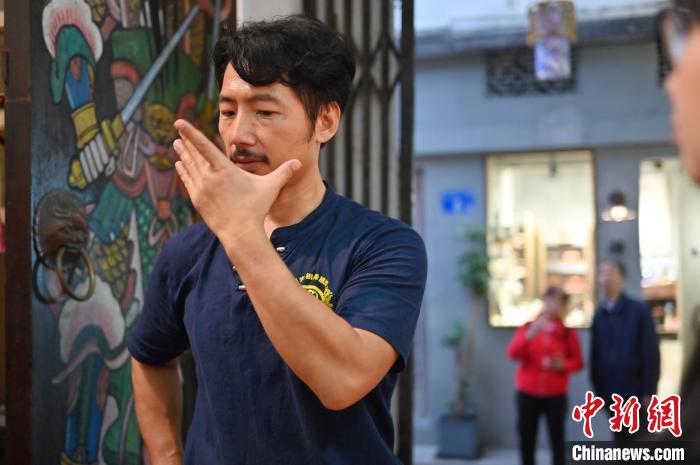11月24日,广州市荔湾区,李健豪展示“粤剧红船木人桩”的要领。中新网