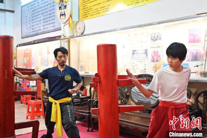 11月24日,广州市荔湾区,李健豪指导他的儿子练习“粤剧红船木人桩”。中新网