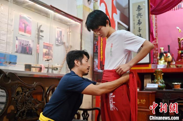 11月24日,广州市荔湾区,李健豪为他的儿子绑好腰带,以便练习“粤剧红船木人桩”。中新网