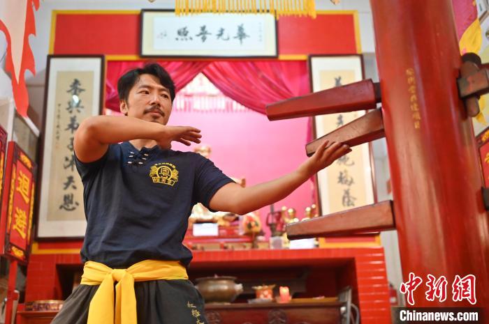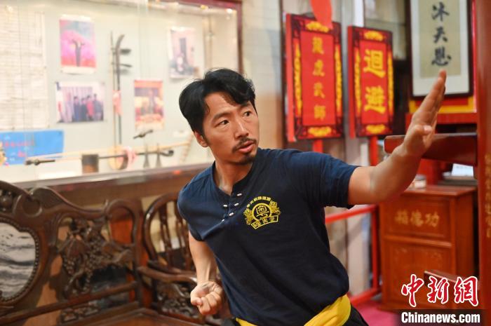 11月24日,广州市荔湾区,李健豪演示“粤剧红船木人桩”。中新网