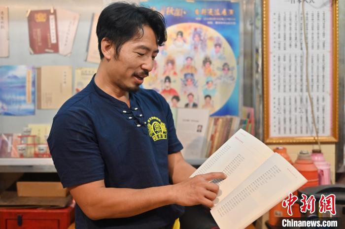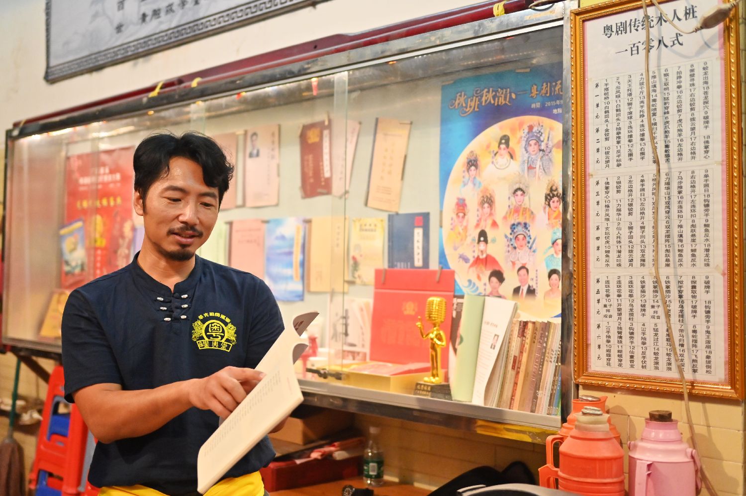 11月24日,广州市荔湾区,李健豪翻阅“粤剧红船木人桩”108式。中新网